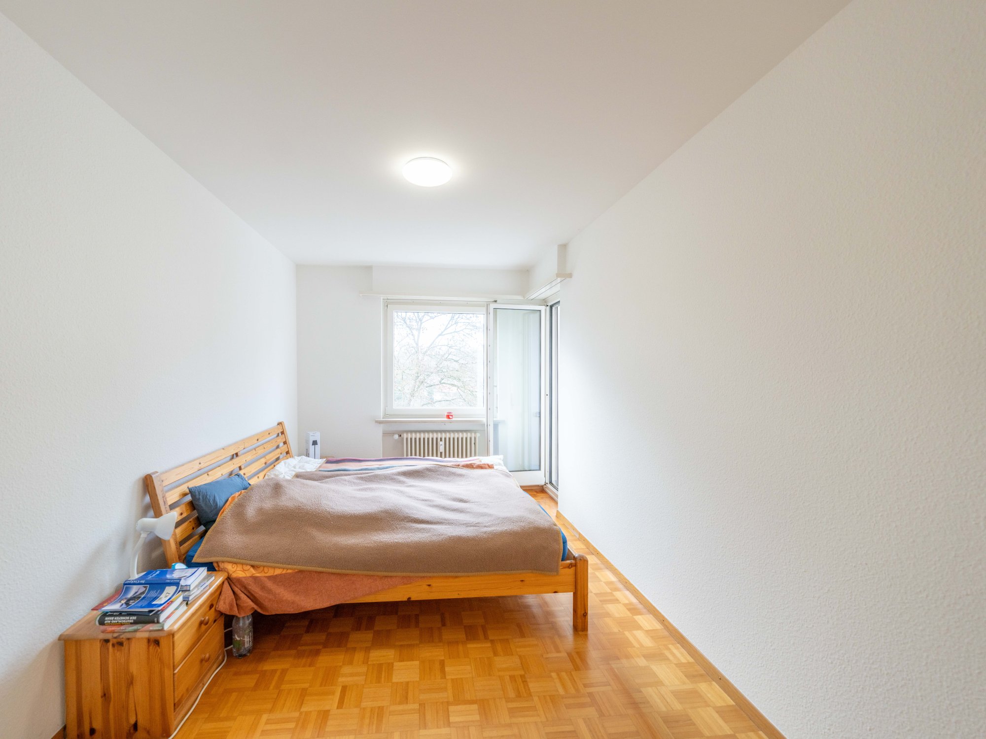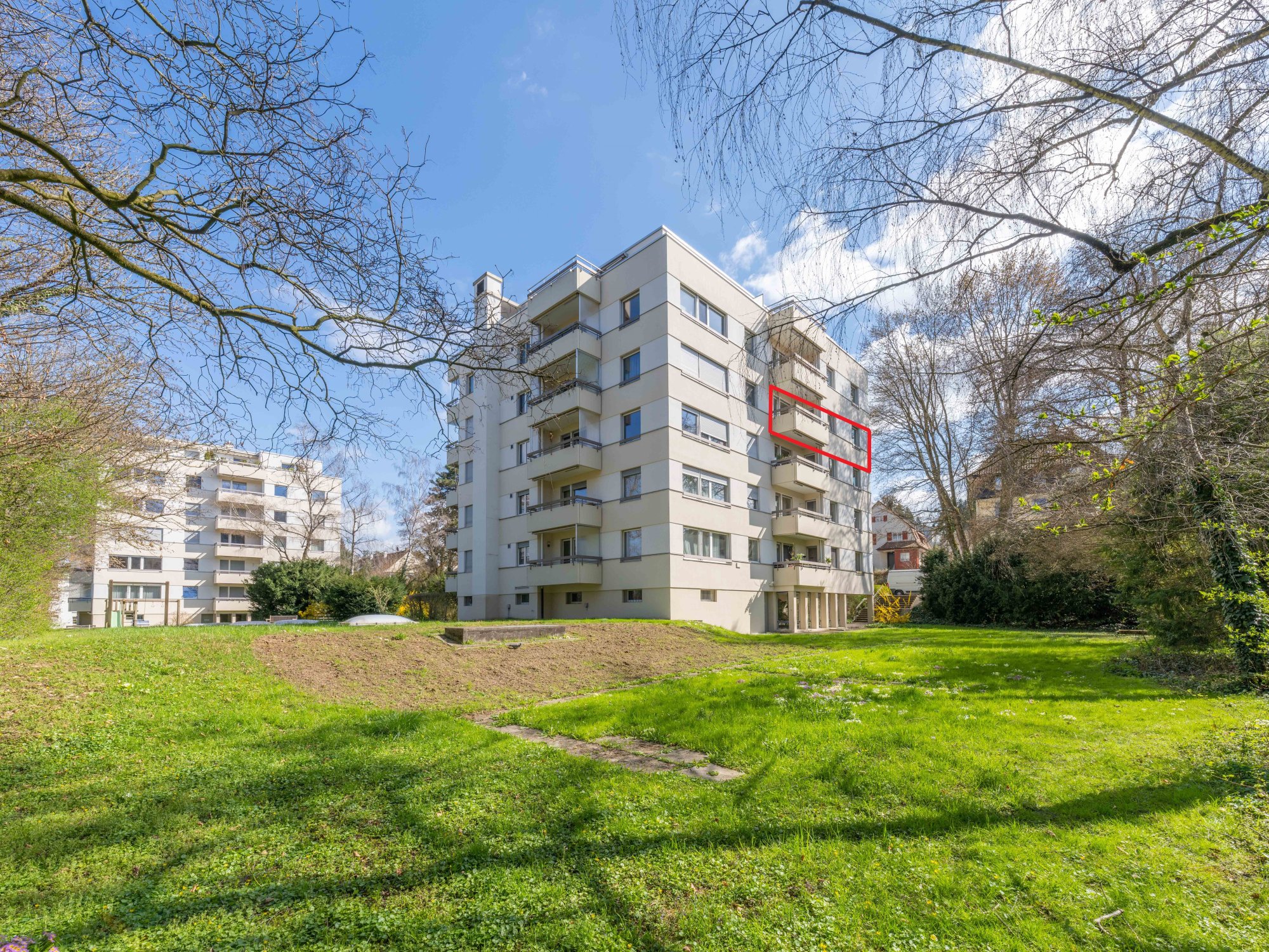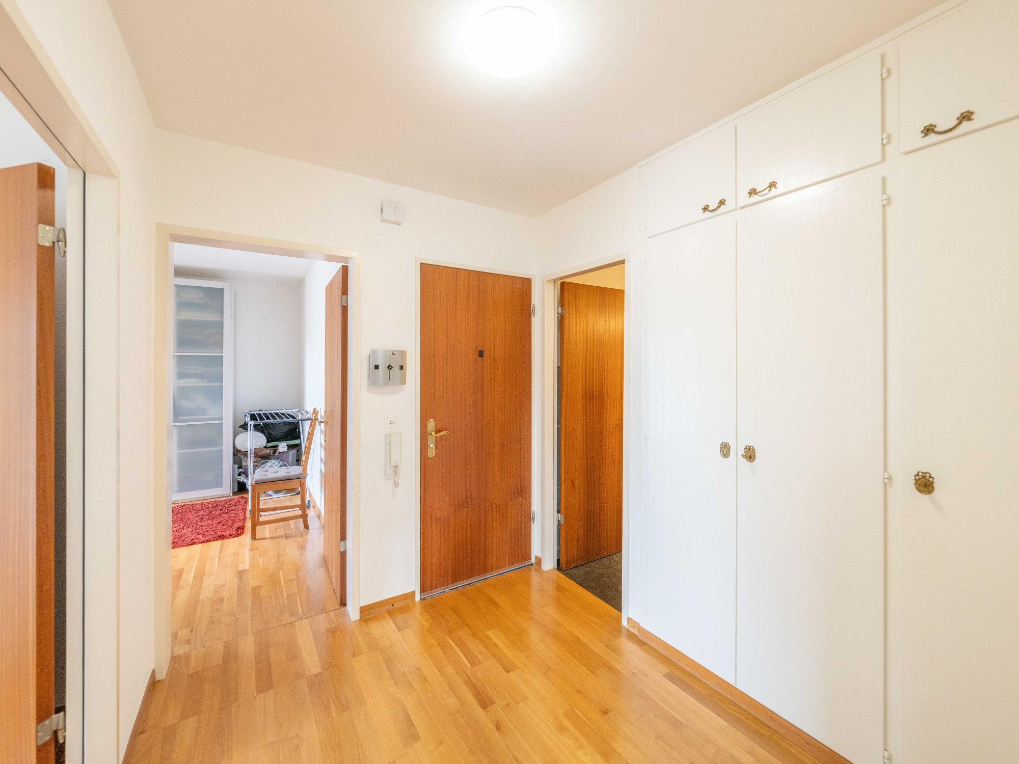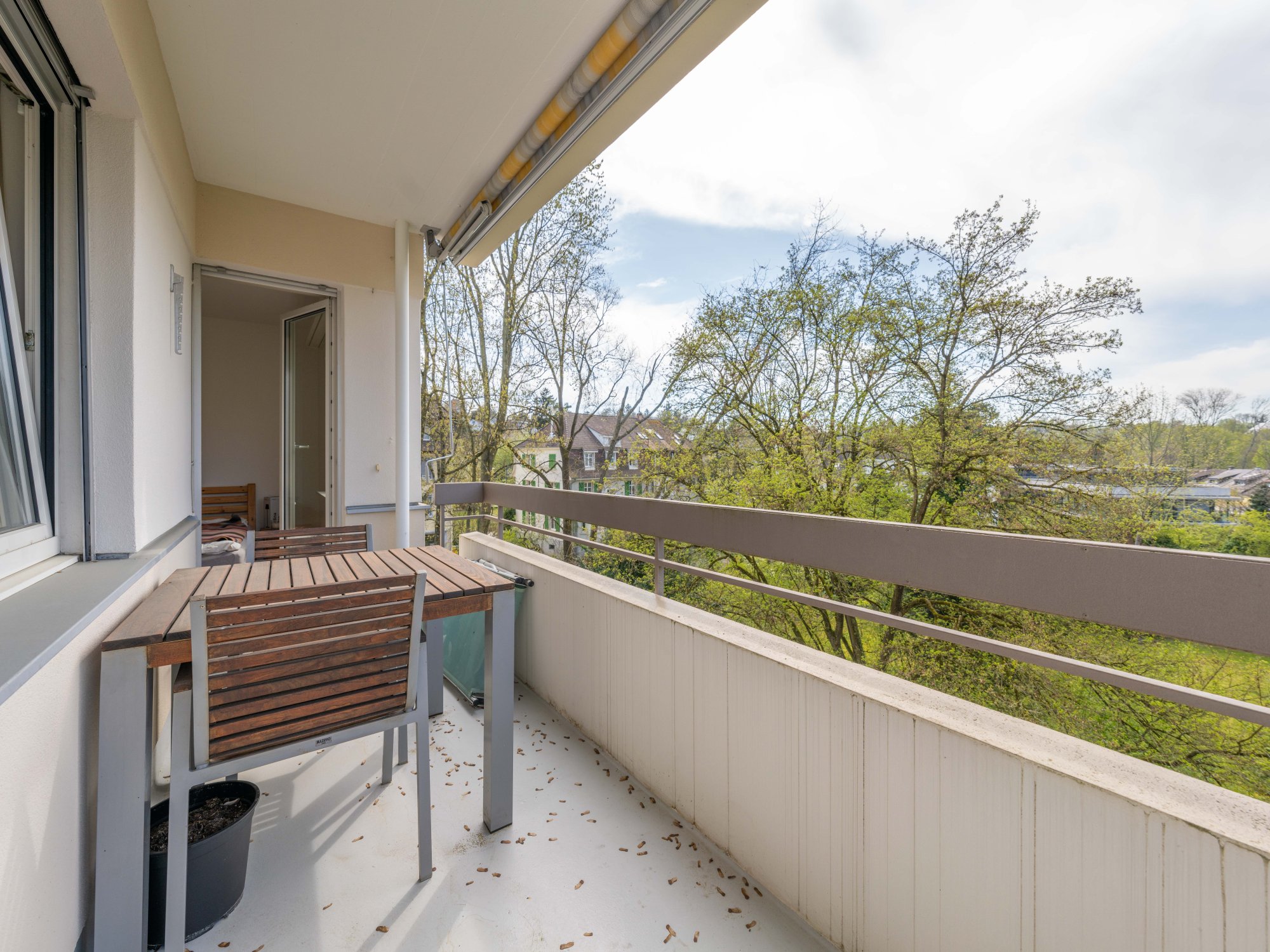 Der Eingangsbereich ist mit einem nützlichen Einbauschrank ausgestattet und führt direkt ins lichtdurchflutete Wohnzimmer mit grossen Fensterflächen. Die separate Küche verfügt über einen eigenen Balkon – ideal für das Frühstück im Freien. Zwei gut geschnittene Schlafzimmer mit Zugang zu einem weiteren Balkon ermöglichen einen schönen Blick ins Grüne und schaffen Rückzugsorte für Ruhe und Erholung. Das Badezimmer ist funktional mit einer Badewanne ausgestattet.