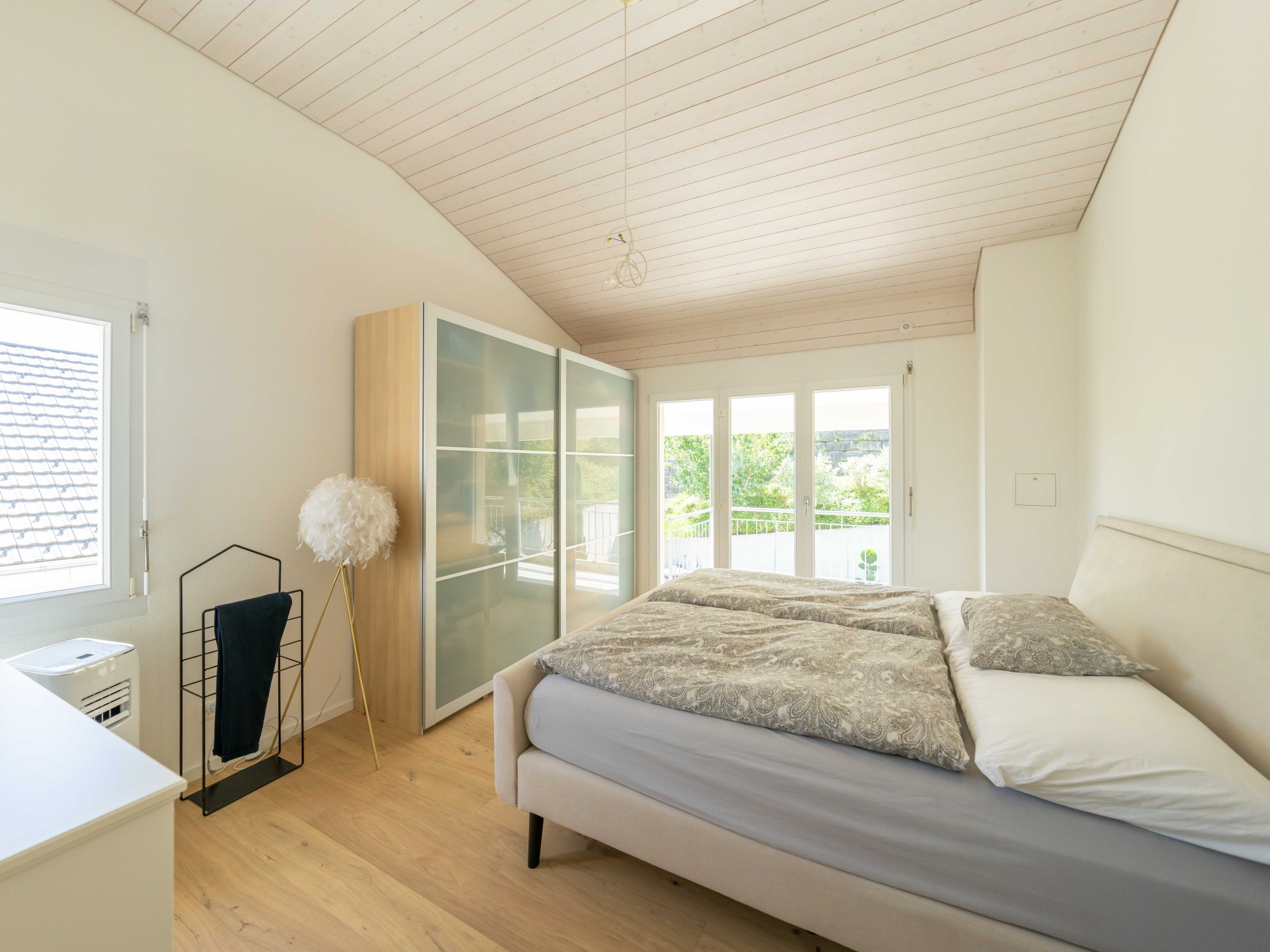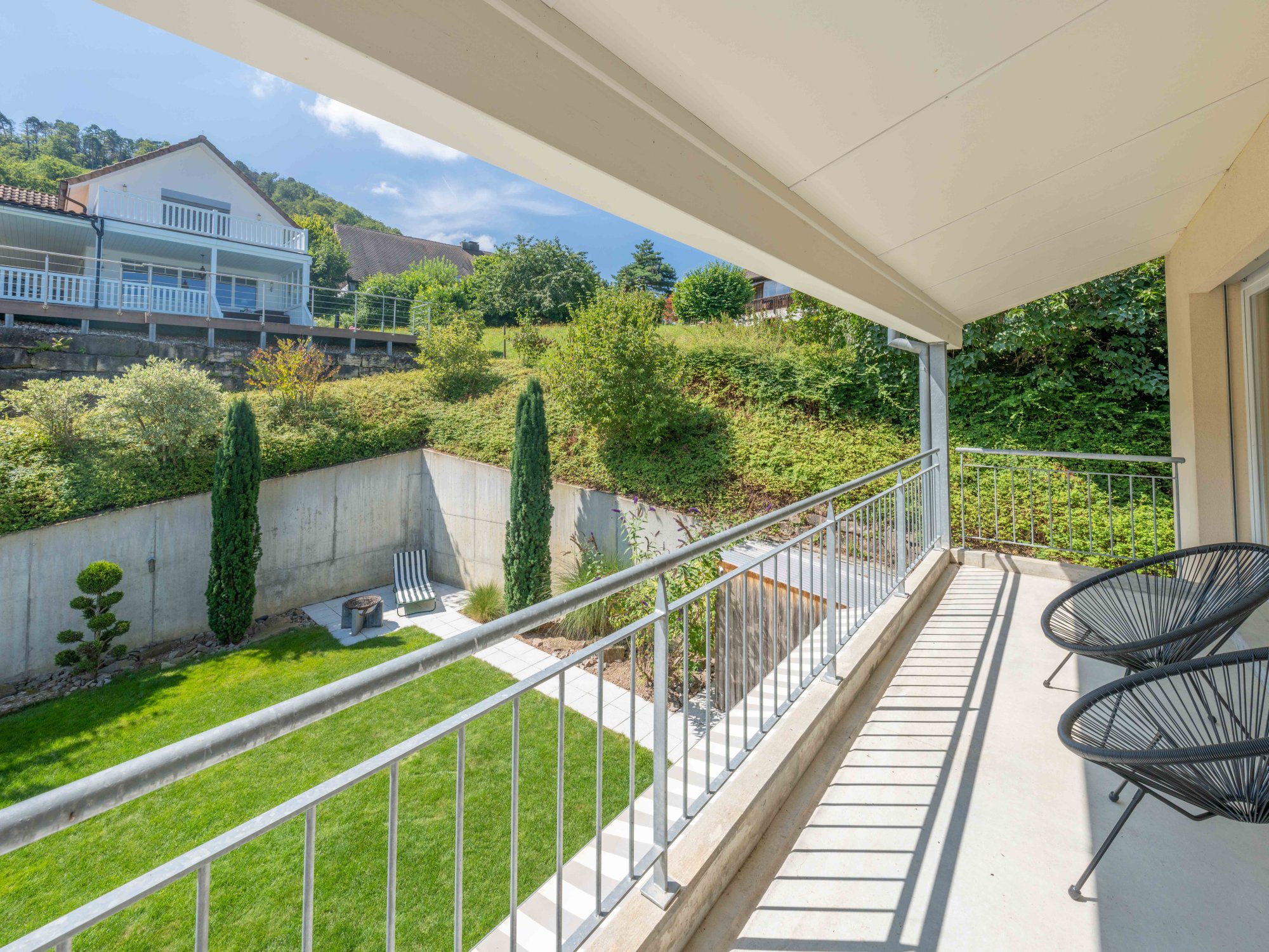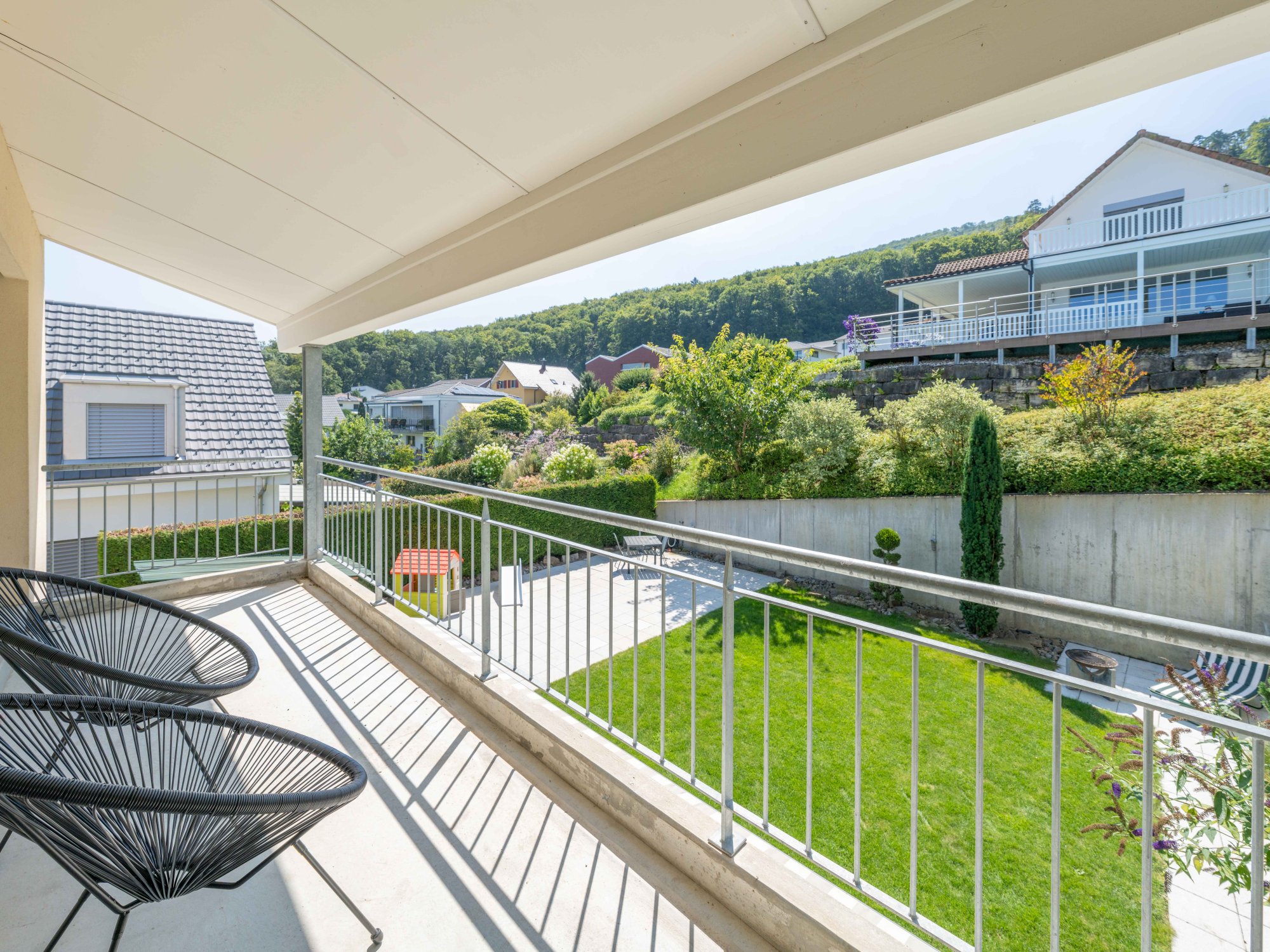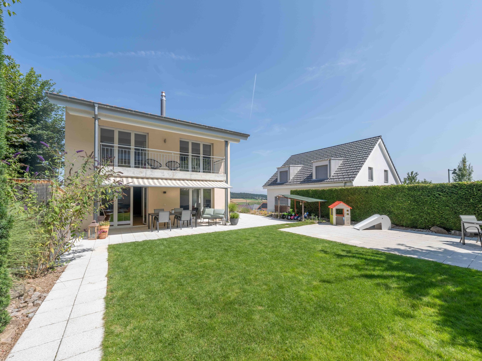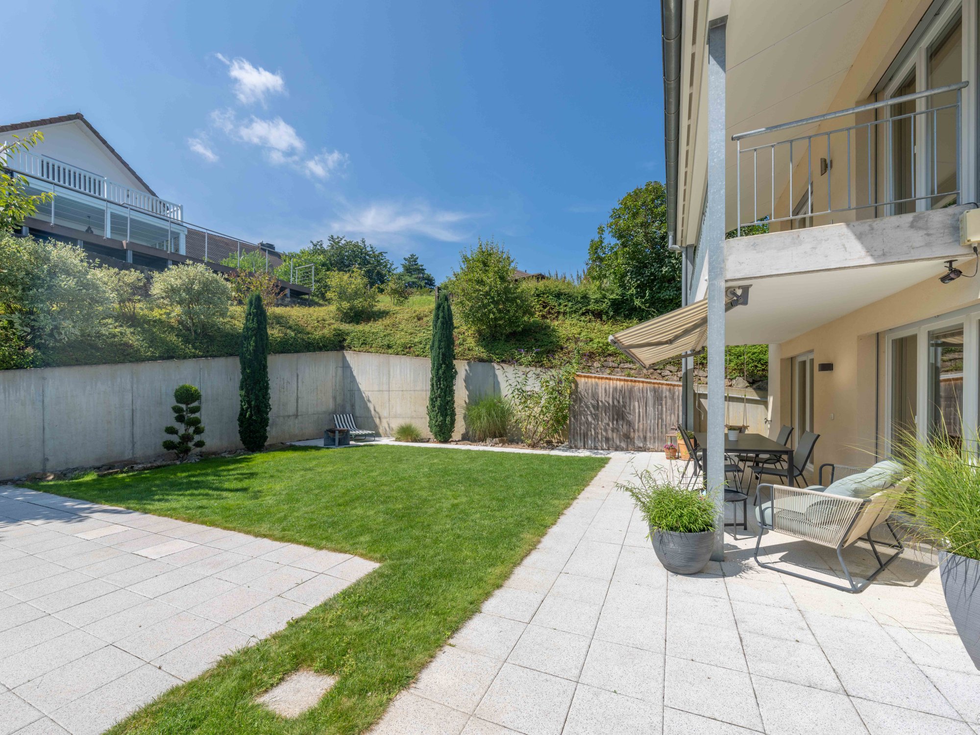 Im oberen Stockwerk befinden sich drei gemütliche Schlafzimmer, die Rückzugsmöglichkeiten und Privatsphäre für Sie und Ihre Familie bieten. Vom grossen Balkon aus geniessen Sie einen herrlichen Blick auf das Gartenparadies. Der Aussenbereich dieses Hauses ist ein echtes Highlight – mehrere Sitzplätze laden zum Entspannen im Freien ein. Eine gelungene Kombination aus gepflasterten Flächen und Rasen schafft ein angenehmes Ambiente für gesellige Aktivitäten und Gartenpartys.