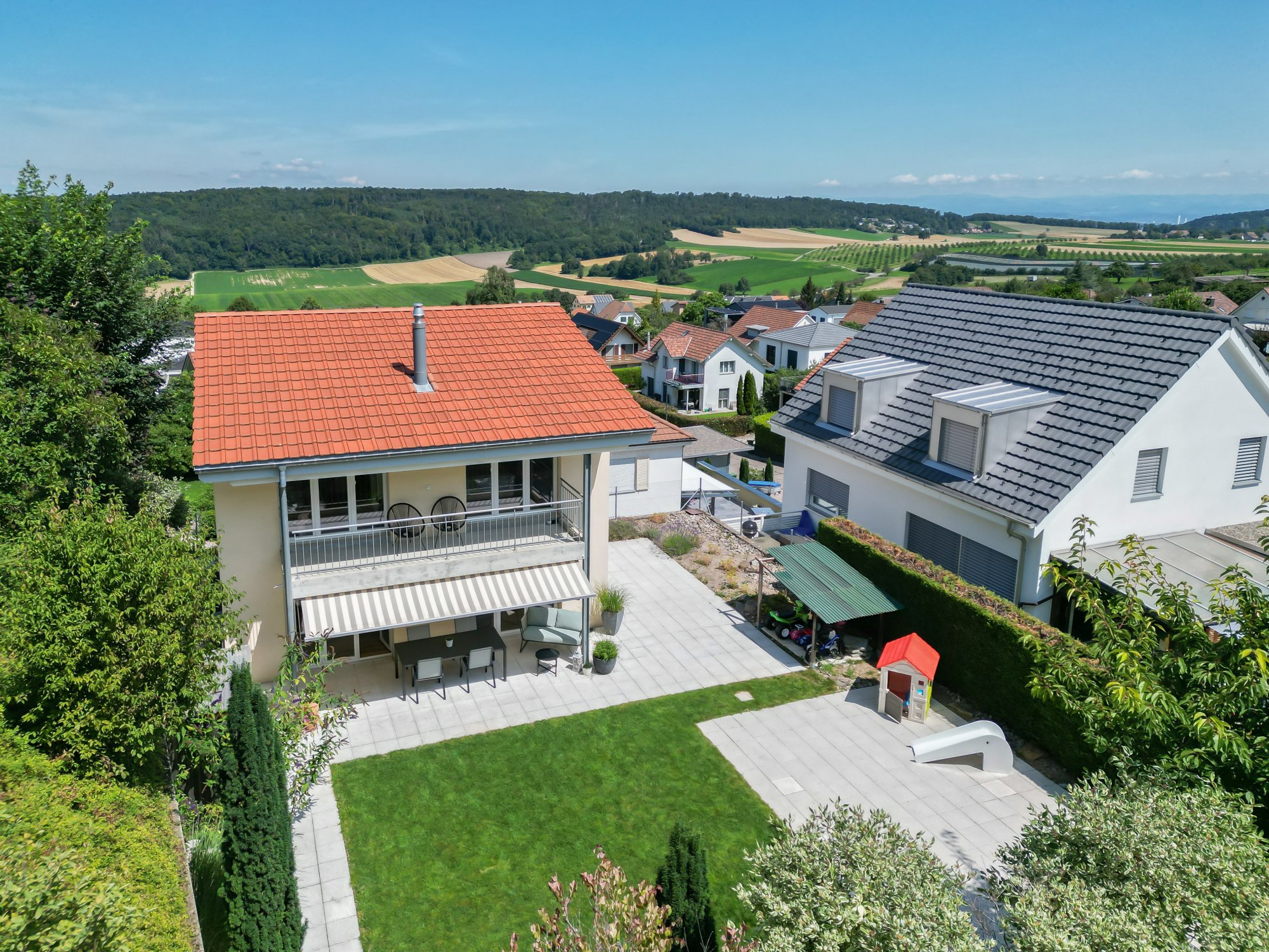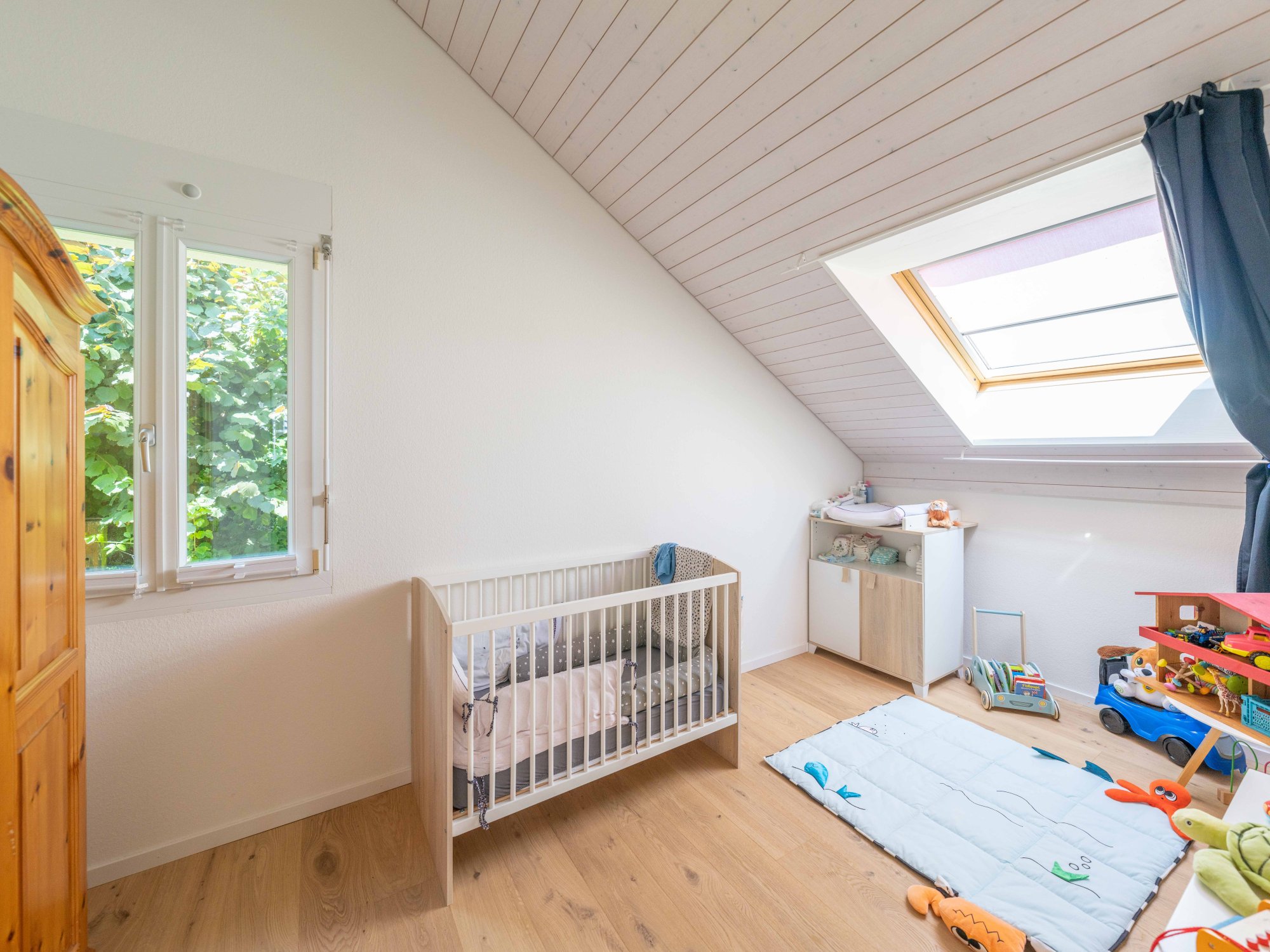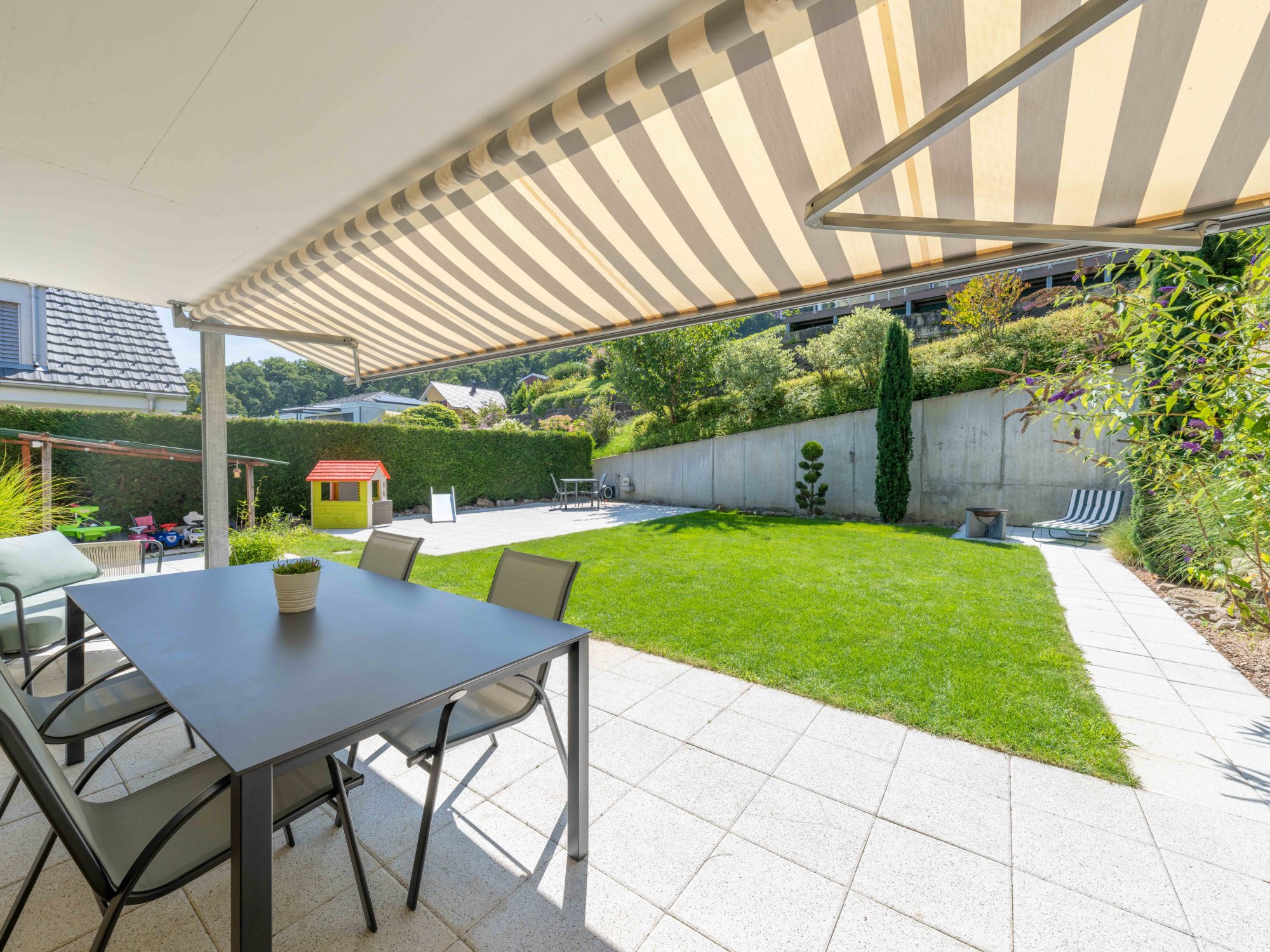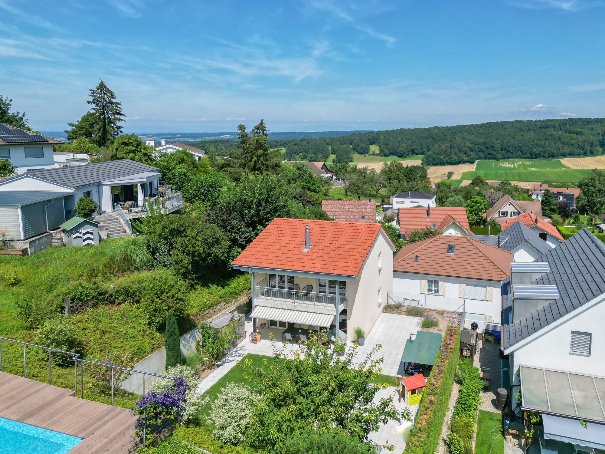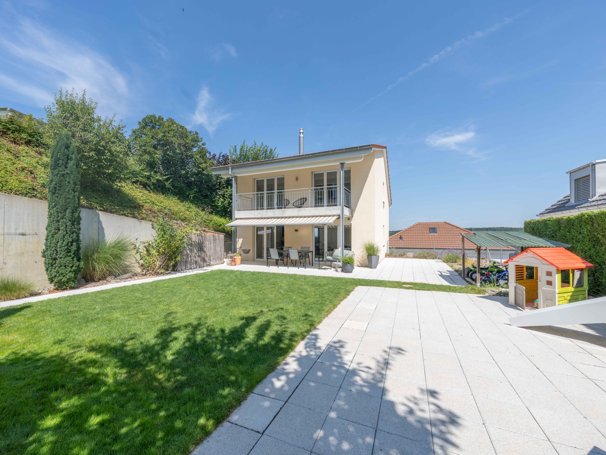 Extras: | - Ausbaupotential von 48.48 m² BGF - Gartenhaus und Schopf - Vorrichtung (Wasser-/Stromleitung) für Pool/Whirlpool - Dampfdusche mit Lichttherapie - Anschlüsse vorbereitet für z.B. eine Sauna - Vorrichtung Cheminée - Fenster und Türen mit erhöhtem Einbruchschutz - Alle Zimmer inkl. Keller mit Anschluss Radio/TV/Internet - Klimagerät Elternschlafzimmer (Abluft nach draussen) - Überwachungs-/Sicherheitsvorrichtung - KITA im Ort |
