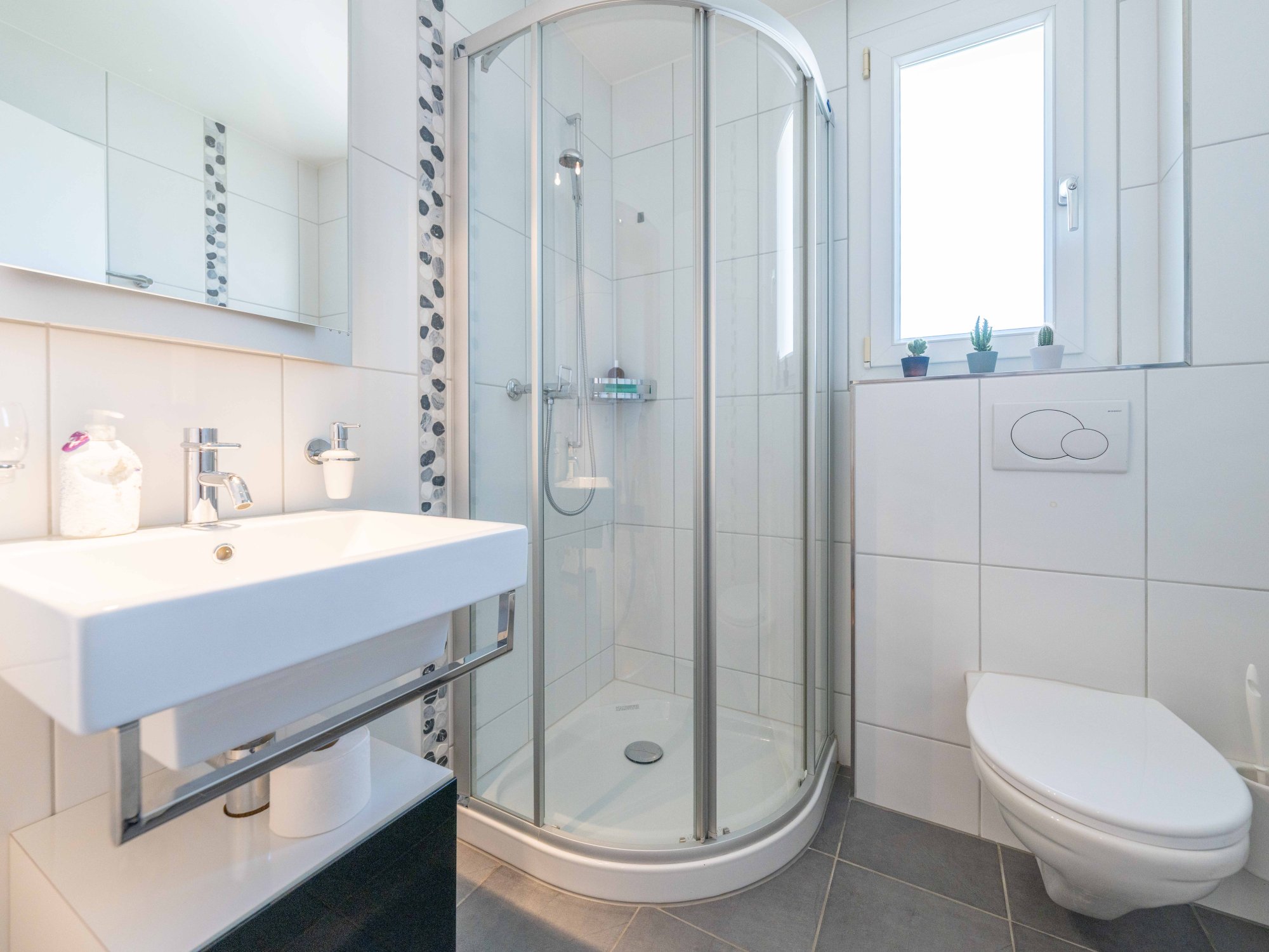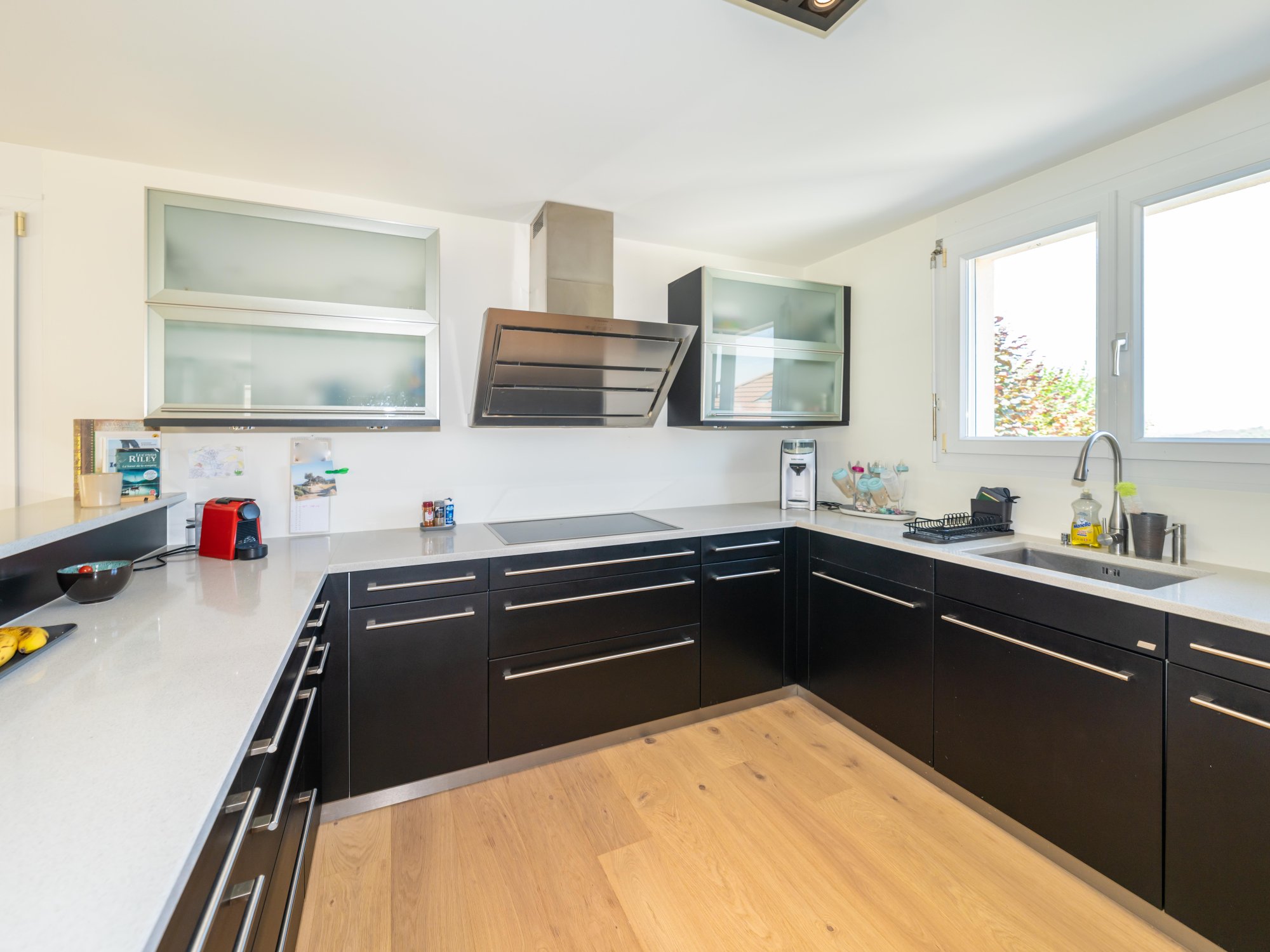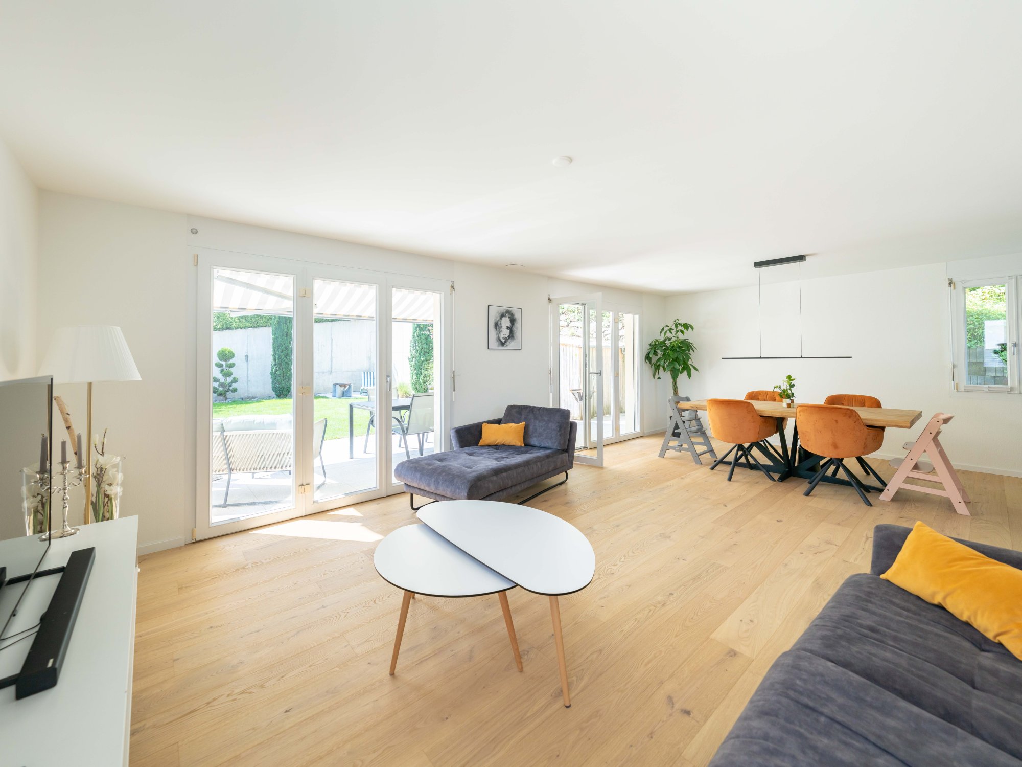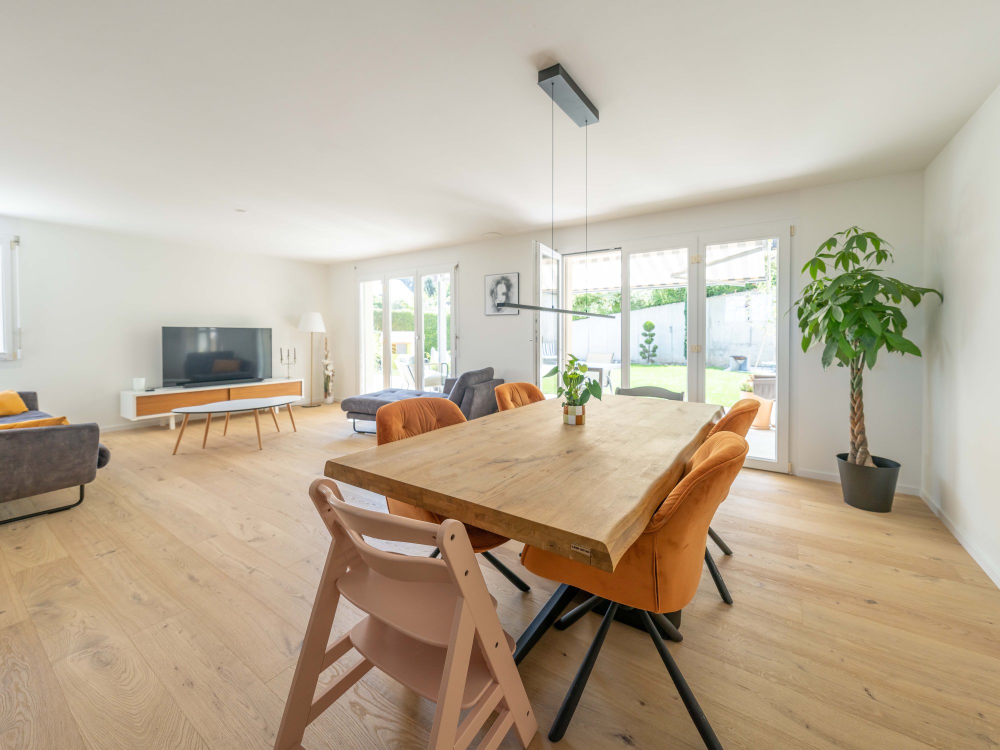 Die grosszügig gestaltete offene Küche und der Wohnbereich bieten ausreichend Platz für Ihre Familie und Gäste. Grosse Fenster sorgen für viel Tageslicht und schaffen eine helle und einladende Atmosphäre.