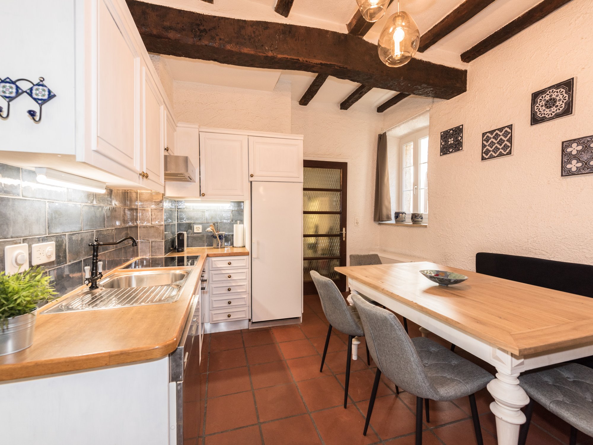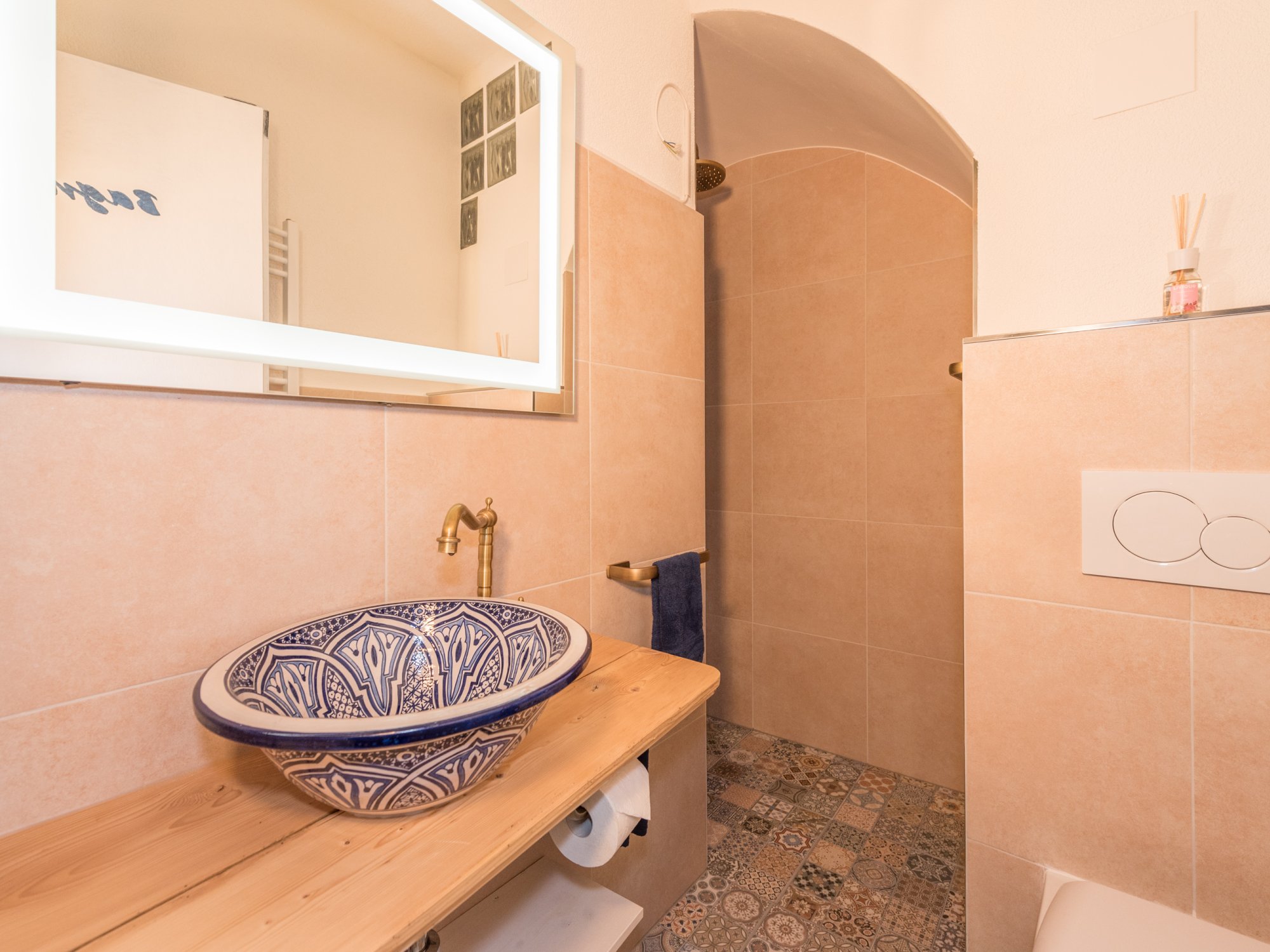 • Mediterranean-style bathroom with walk-in shower (renovated in 2020) on the ground floor