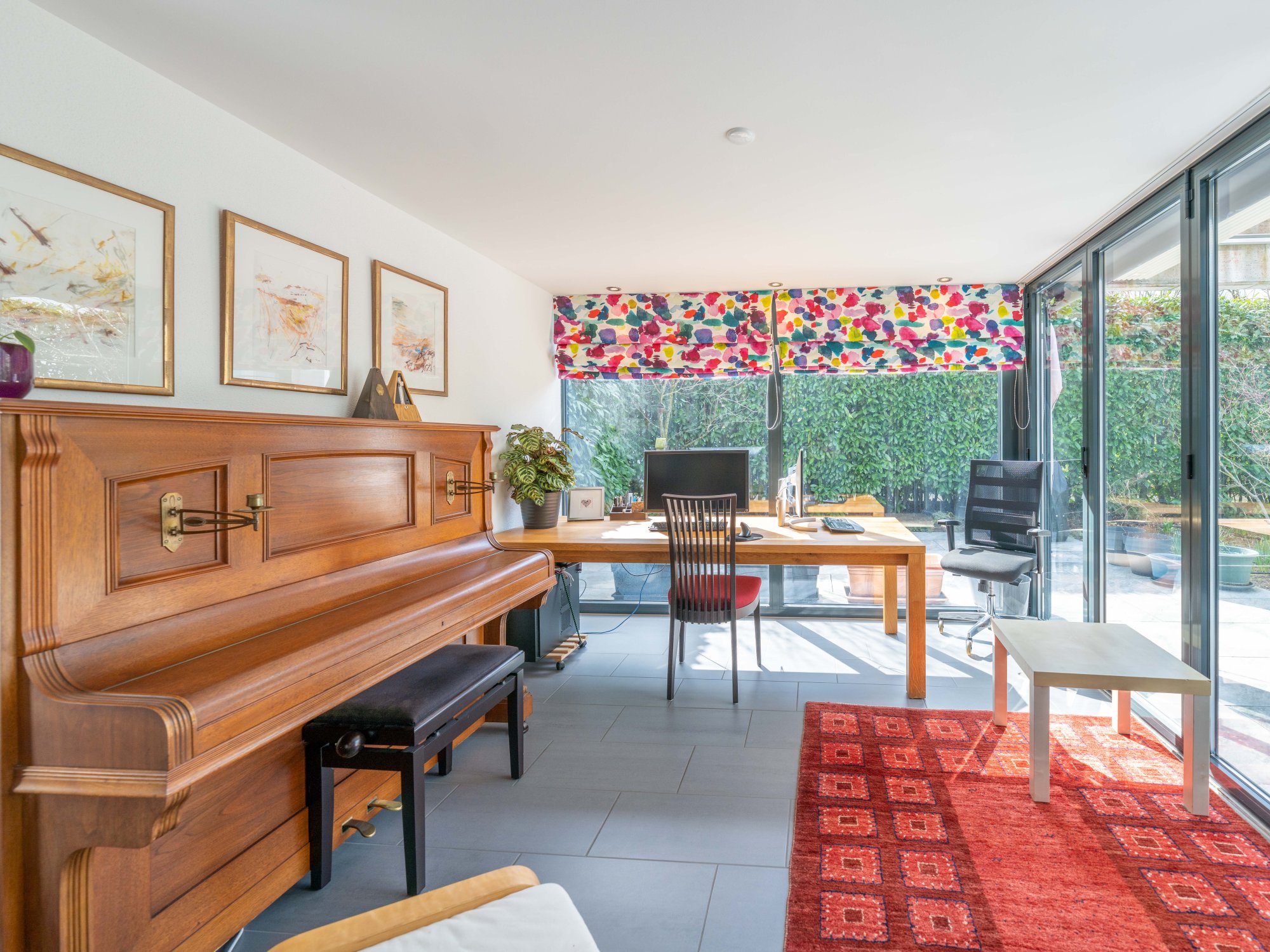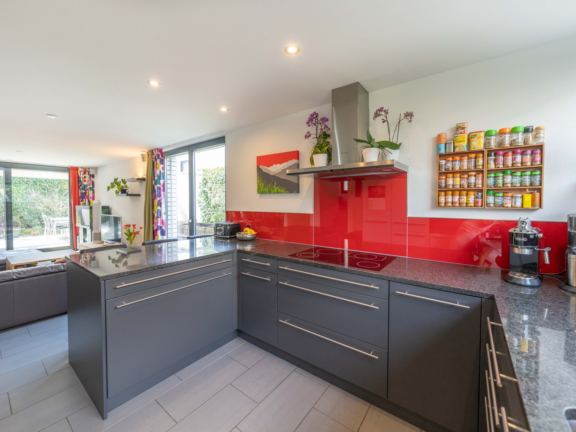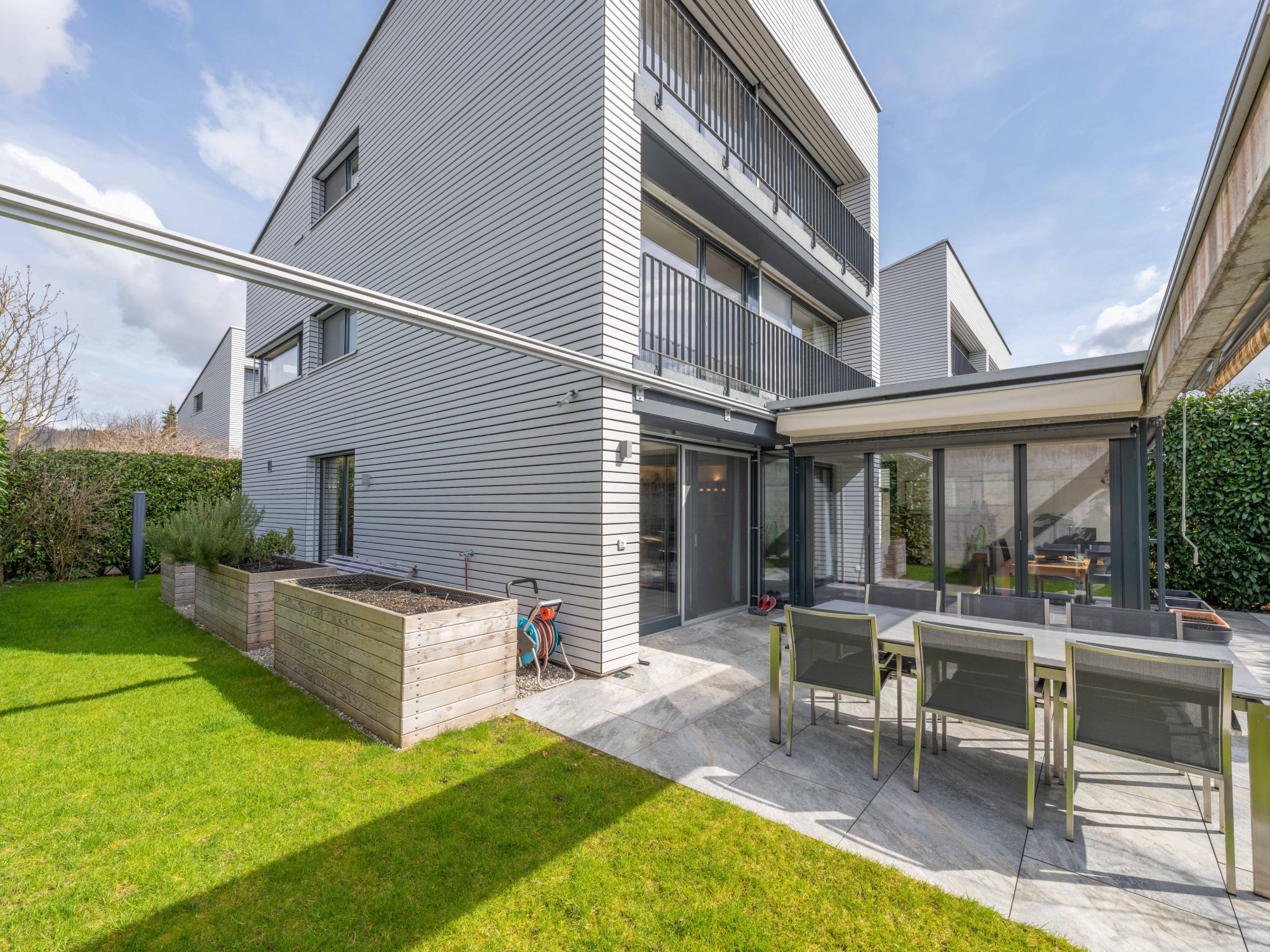 Im Erdgeschoss befindet sich der Eingangsbereich mit Garderobe und ein separates WC. Die moderne und offene Küche bietet direkten Durchgang zum lichtdurchfluteten Wohn- und Essbereich mit angrenzendem, beheiztem Wintergarten. Der Wohnbereich bietet direkten Zugang zum gemütlichen Gartensitzplatz.