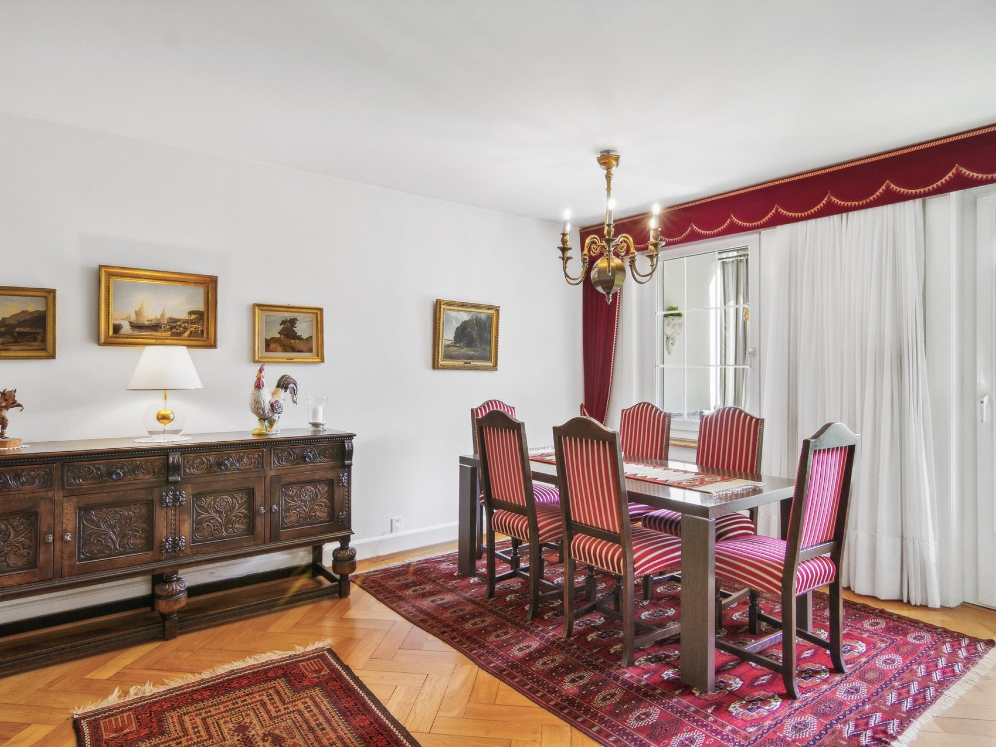 Geniessen Sie den Charme der originalen Altbauelemente dieses schönen Liebhaberobjekts, wie das Fischgrätparkett im Wohn-/Essbereich und die Holztreppe.