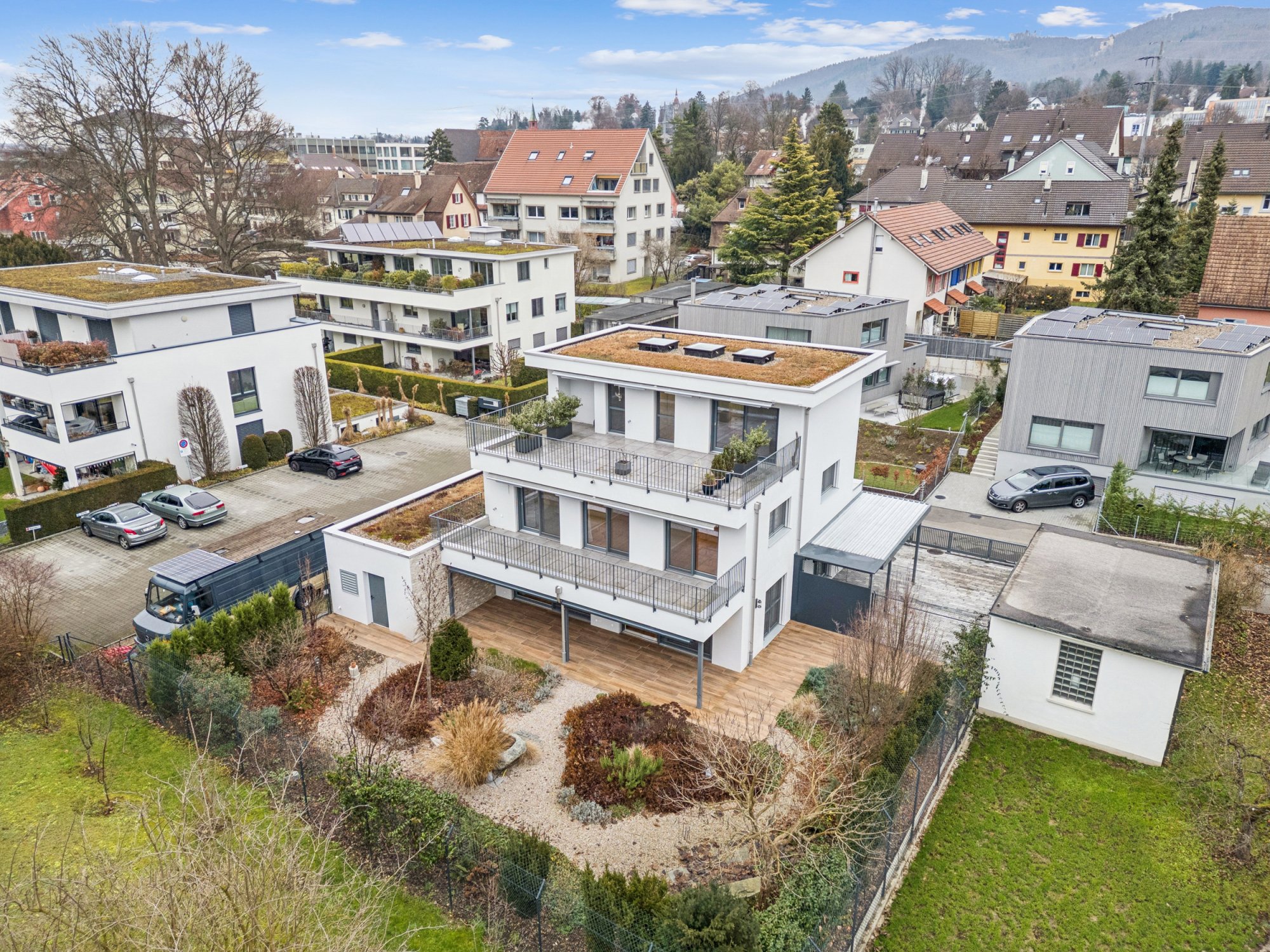 | Extras: | Lift in alle Etagen, Grundstück und Garten komplett eingezäunt, Einfahrtstore zum Grundstück, Luxusküche von Poggenpohl mit Premiumhaushaltgeräten u.a. Steamer, Backofen, Bora-Kochfeld, 2x Geschirrspüler, 2x Waschbecken, Weinkühler, hochwertige Fronten und Arbeitsflächen, Kochinsel mit Theke. Smart-Home-Steuerung im gesamten Gebäude ( u.a. Beleuchtung Innen wie Aussen und Storen). Entkalkungsanlage, Ladestation im Carport, ca. 5 Aussenparkplätze, geräumige Garage, diverse Einbauschränke, Ankleideraum mit Schiebetüren, Wirtschaftsraum mit WA/TU, Dachterrasse rund 40m² mit Möglichkeit für Whirlpool oder Sauna, Fliegenschutzgitter an allen Fenstern, Gartenanlage mit reichhaltiger Bepflanzung und einem Brunnen aus einem Tessiner Findling (Smarthome gesteuert). |