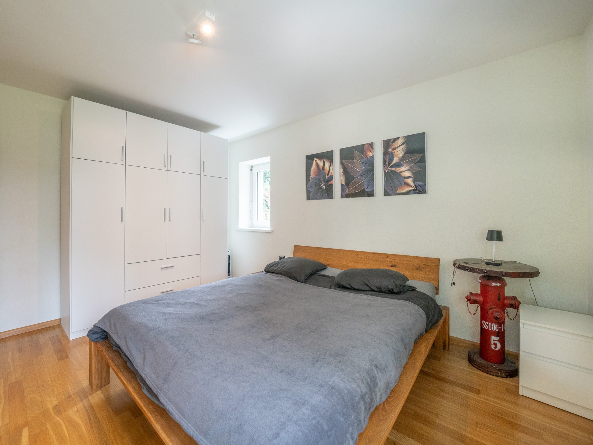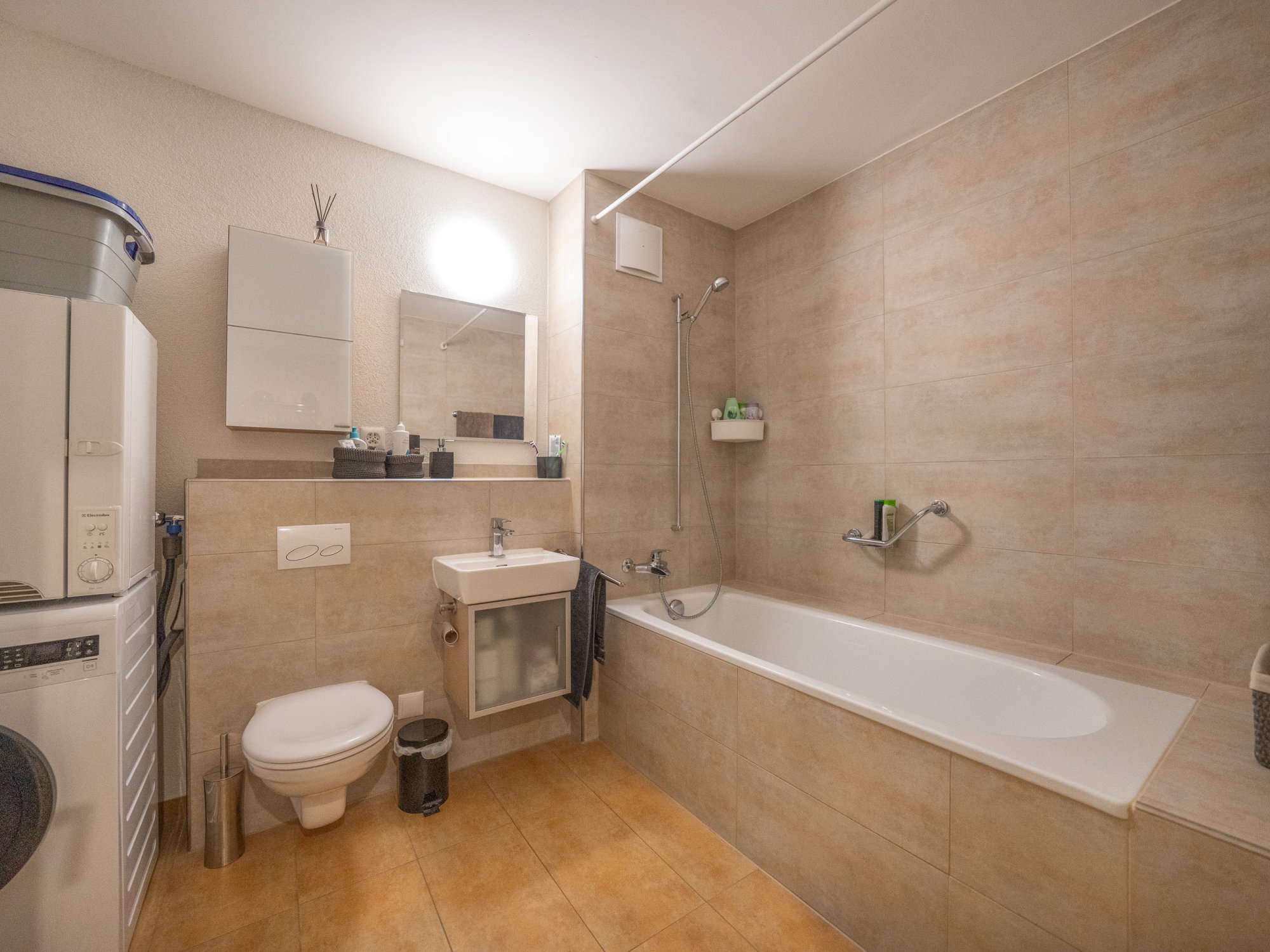 Das grosszügige Badezimmer ist mit eigener Waschmaschine und Tumbler ausgestattet. Ein praktisches Reduit sowie ein separates Kellerabteil sorgen für zusätzlichen Stauraum. Ein Parkplatz in der Tiefgarage gehört ebenfalls zur Wohnung.