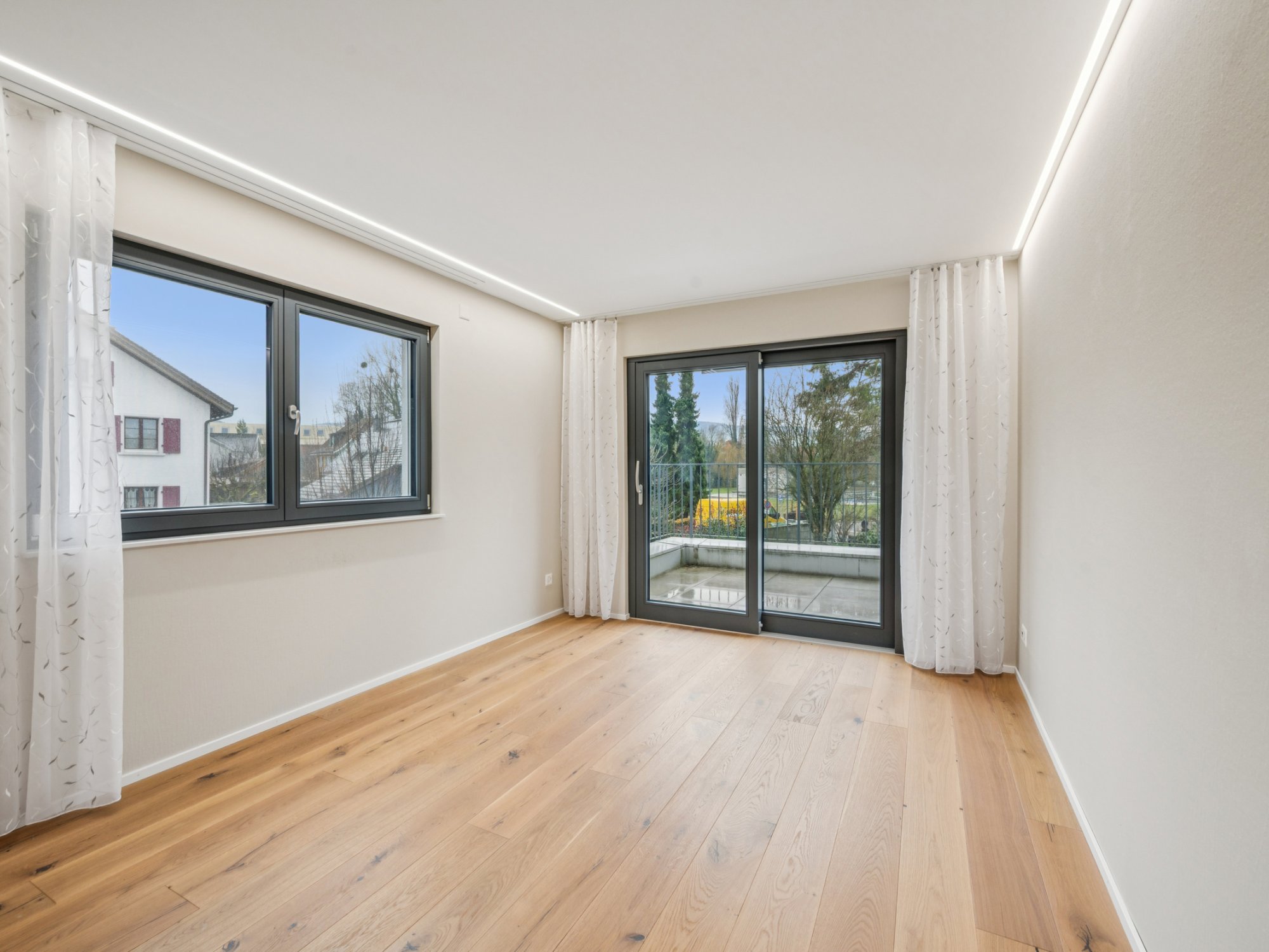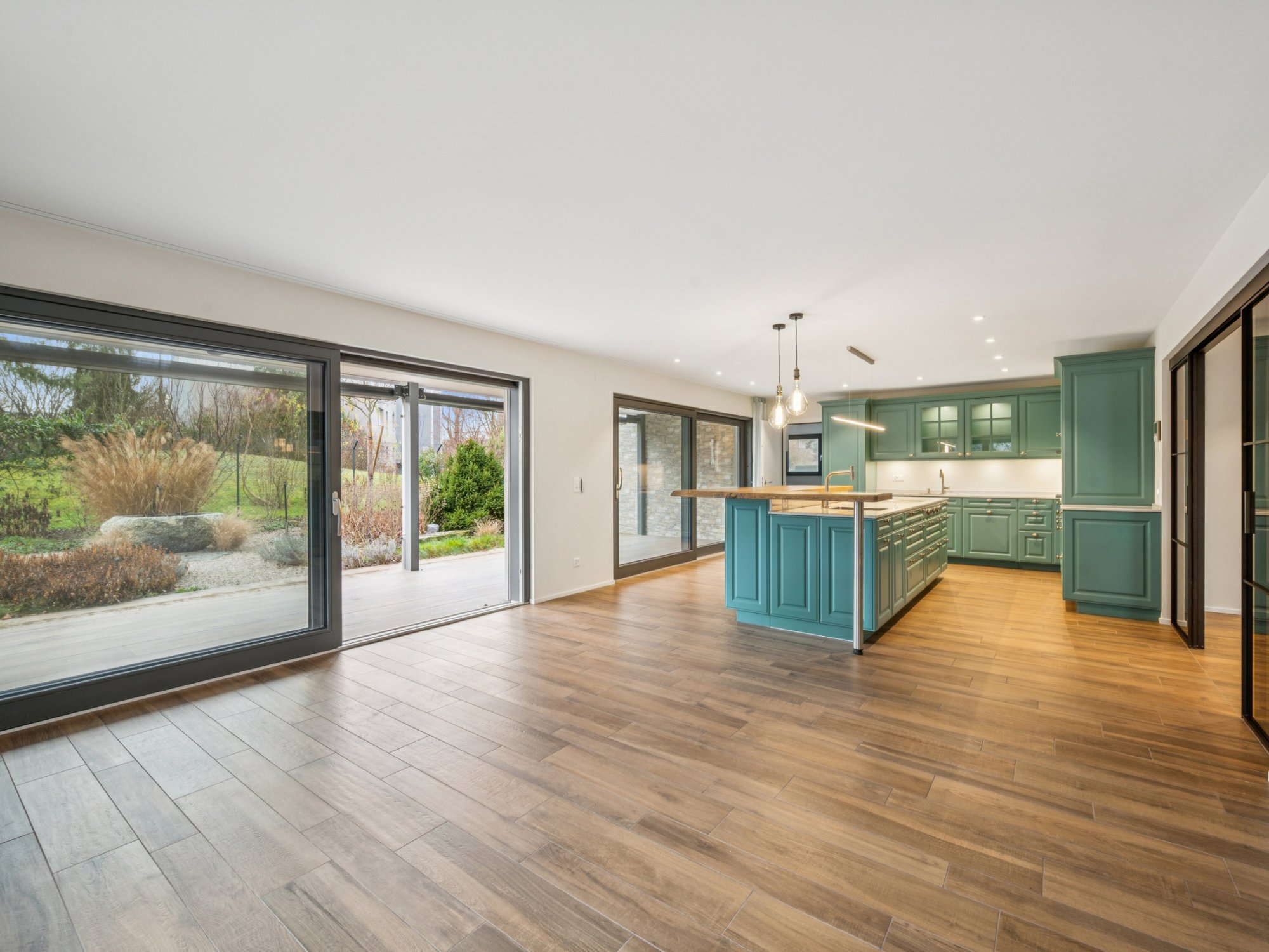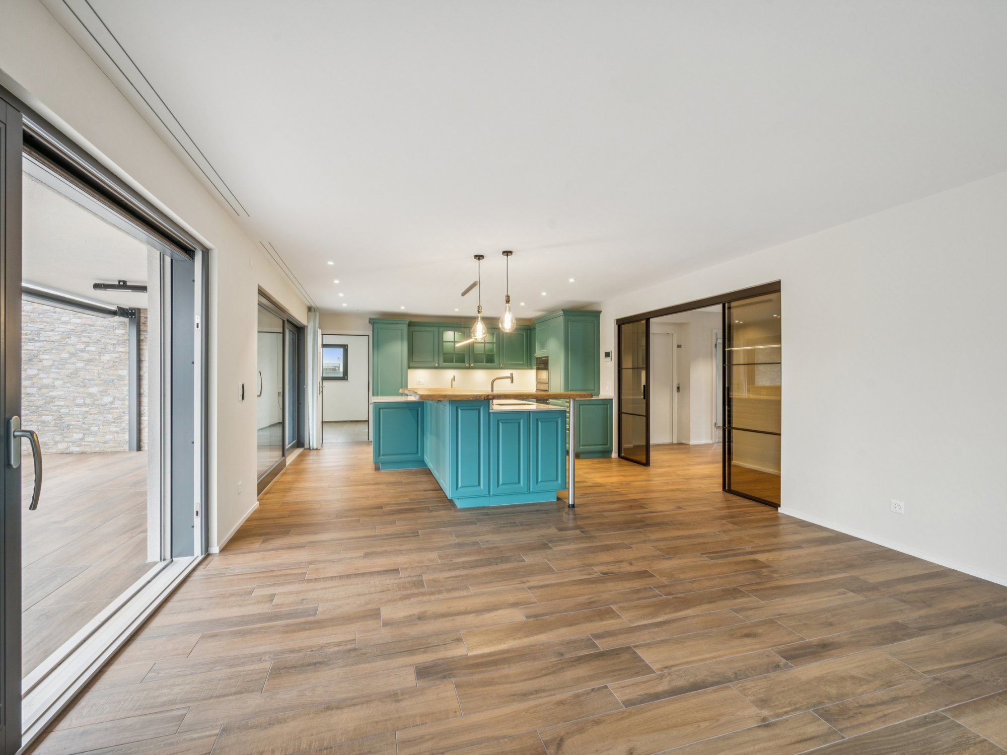 Ein Wirtschaftsraum mit Waschmaschine und Trockner, ein grosszügiges Entrée mit Einbauschränken, hochwertige Glas-Schiebetüren und pflegeleichter Plattenboden in Holzoptik runden das Wohnangebot ab.