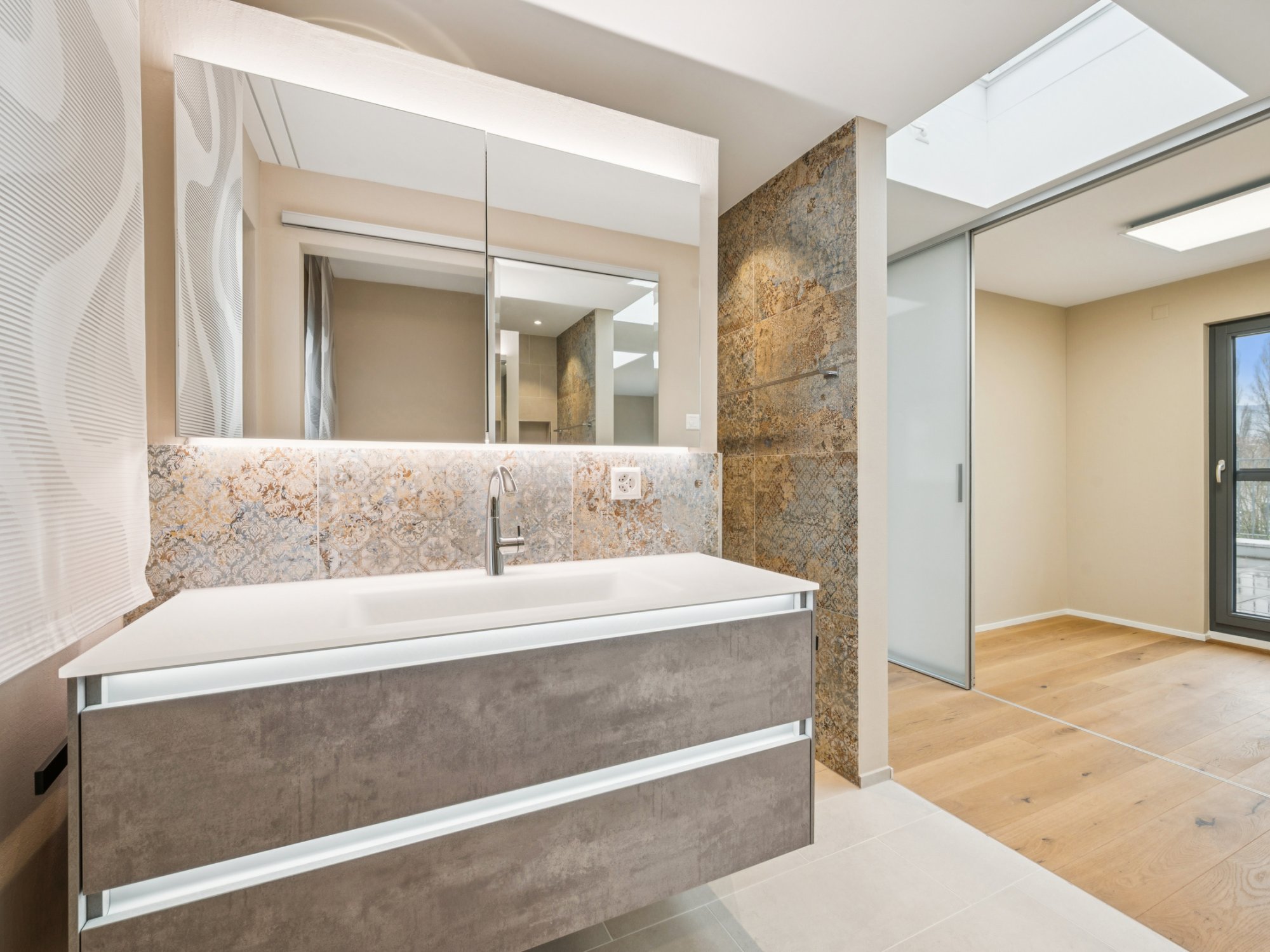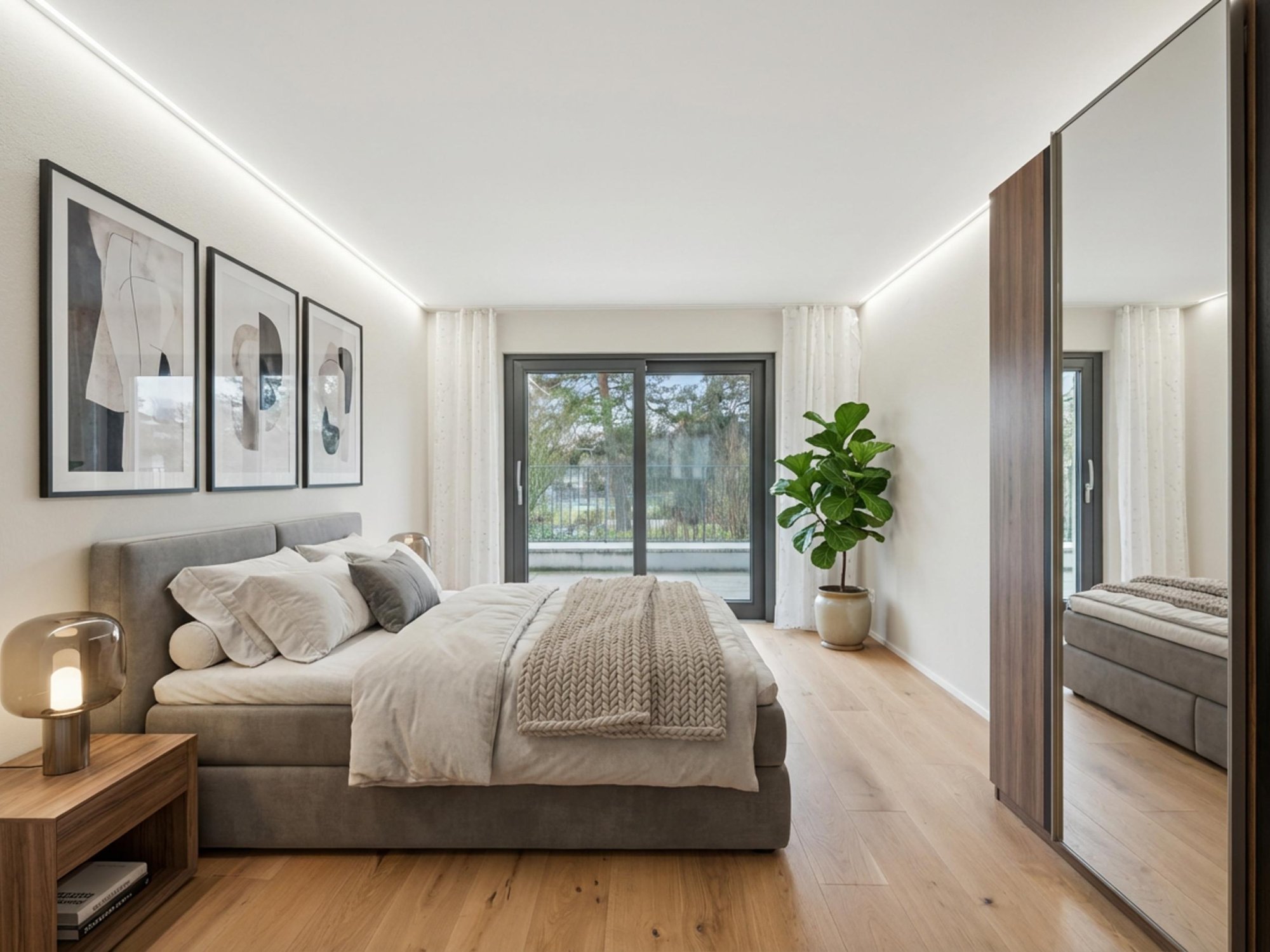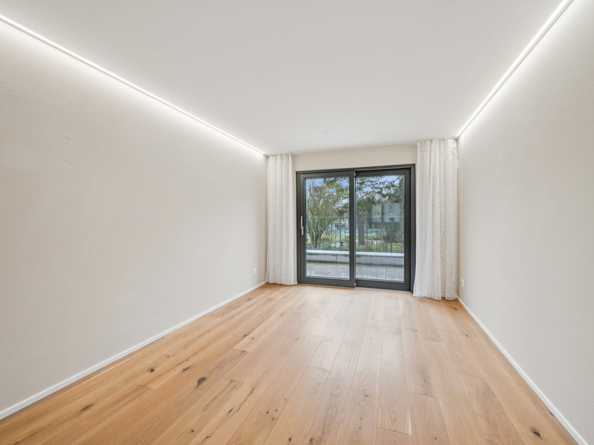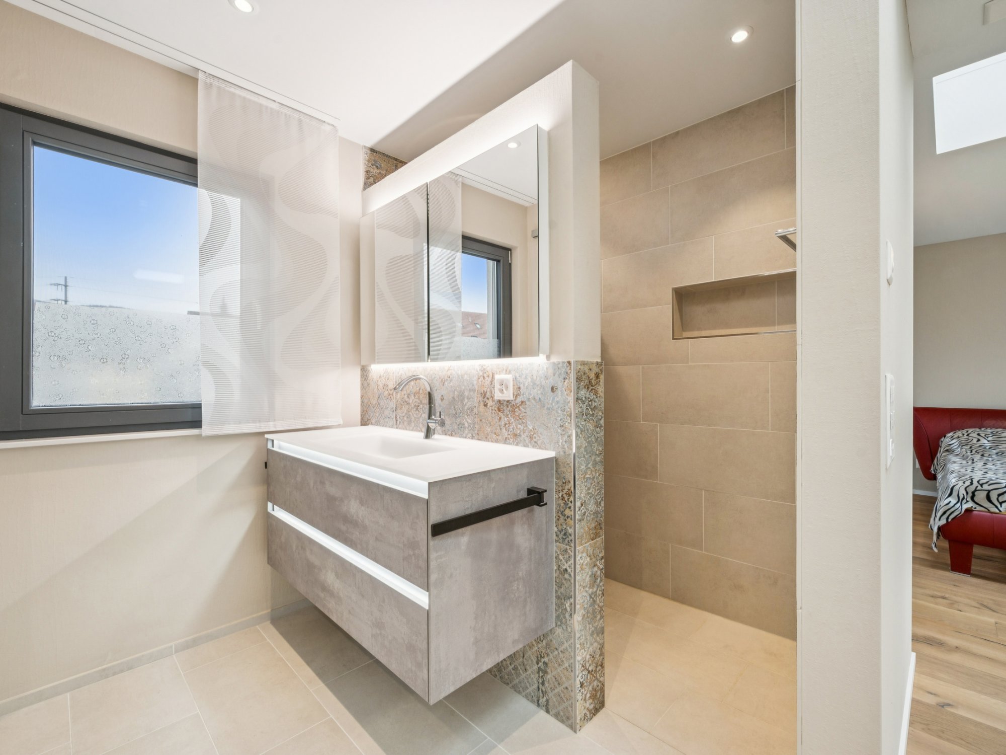 Ein Wirtschaftsraum mit Waschmaschine und Trockner, ein grosszügiges Entrée mit Einbauschränken, hochwertige Glas-Schiebetüren und pflegeleichter Plattenboden in Holzoptik runden das Wohnangebot ab.