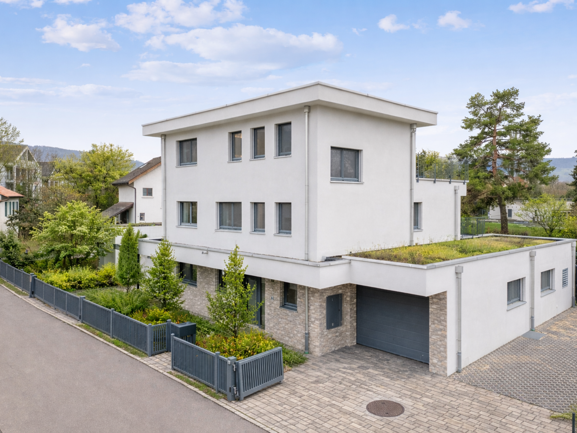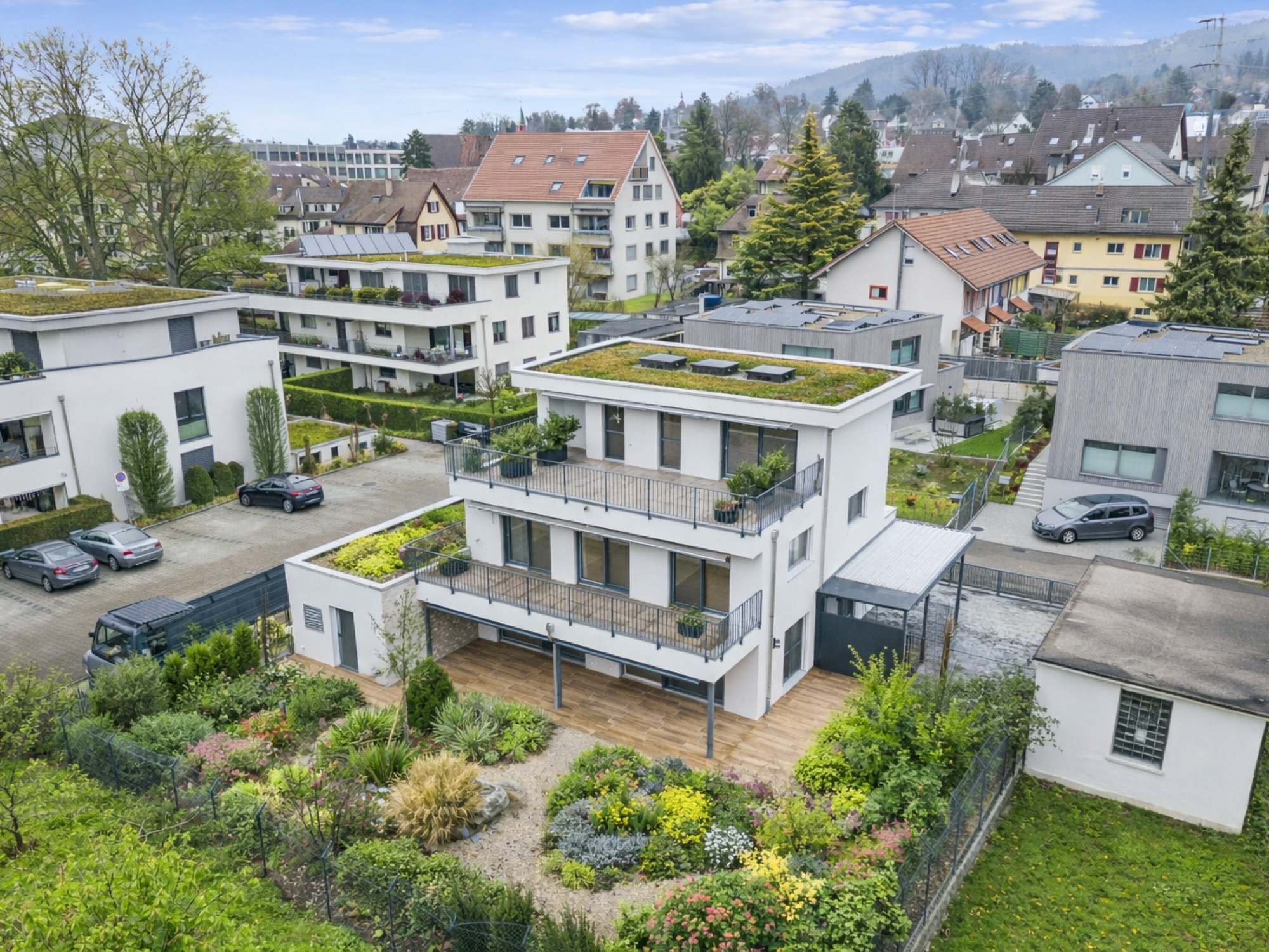 Zur Immobilie gehören eine Garage mit direktem Zugang ins Haus, ein Carport mit Ladestation für Elektroautos sowie 4 bis 5 Aussenparkplätze, auch für Wohnmobile geeignet, und elektrisch bedienbare Tore. Die Dachterrasse und Gartenanlage sind vollständig Smarthome-gesteuert und alle Fenster sind mit Fliegenschutzgittern ausgestattet.