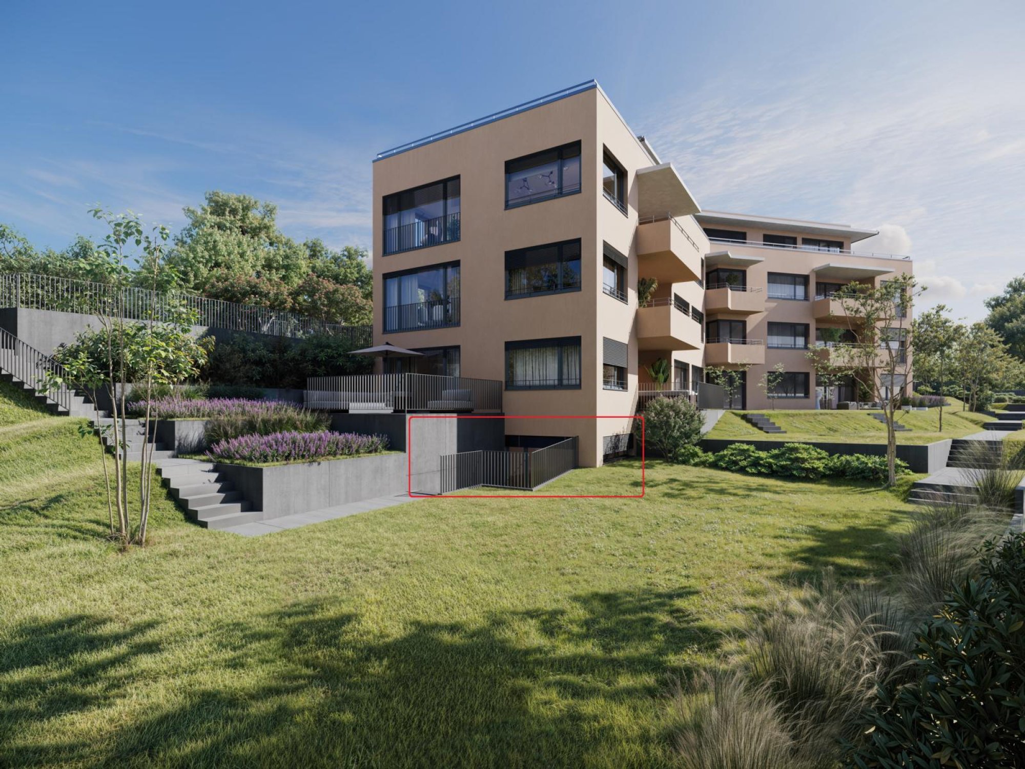 Die offene 1 Zi.-Wohnung (W1) mit einem Badezimmer befindet sich im Souterrain und ist über das Treppenhaus mit Lift als auch über die Aussentreppen der Gartenanlage erreichbar.