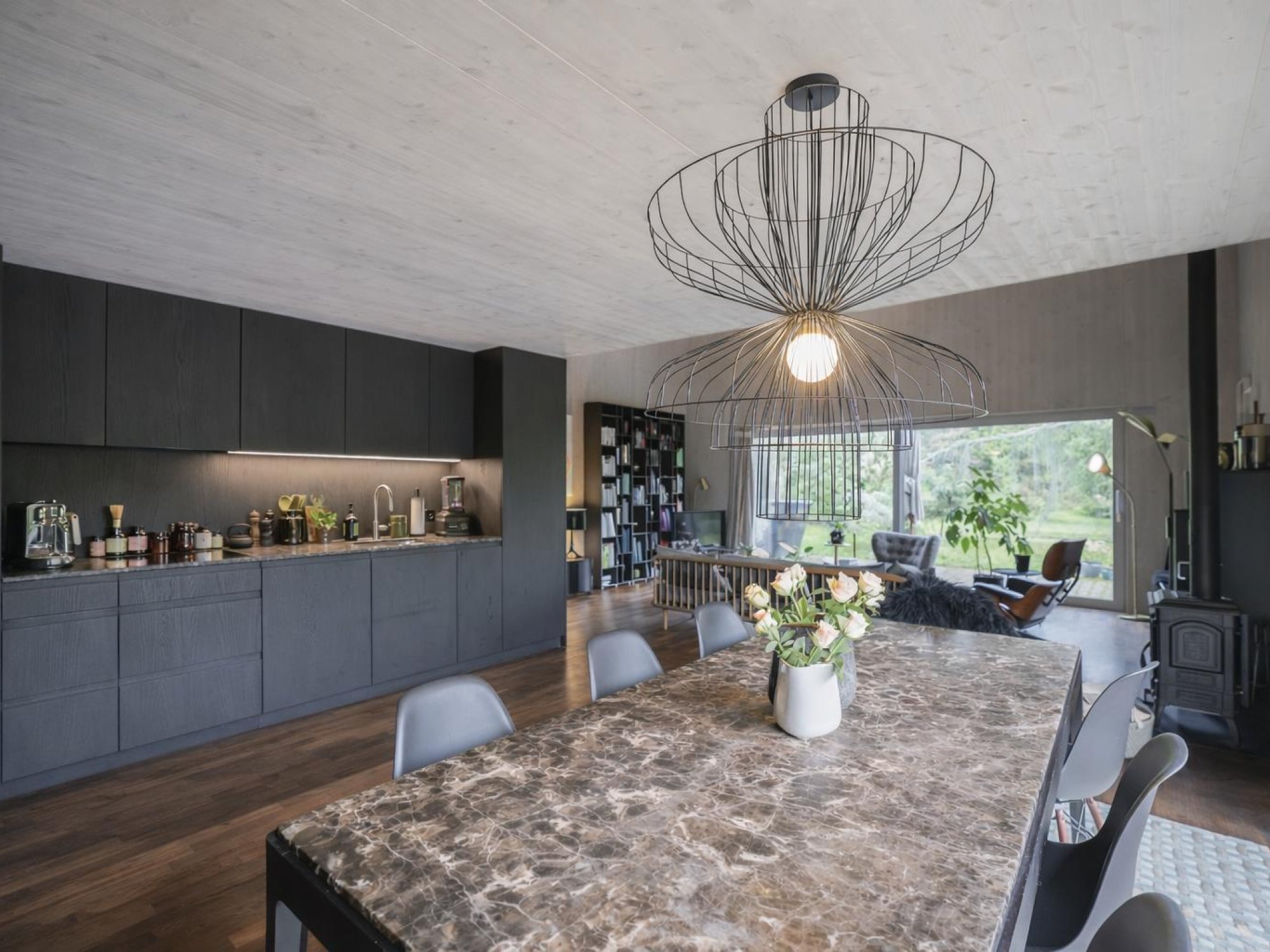 Das Herzstück des Hauses bildet zweifellos der offen gestaltete Wohn-, Ess- und Küchenbereich. Durch die Galerie im Obergeschoss entsteht hier eine beeindruckende Raumhöhe, die ein aussergewöhnliches Wohngefühl vermittelt. Grosszügigkeit, Lichtdurchflutung und architektonische Raffinesse vereinen sich zu einer warmen, heimeligen Atmosphäre mit besonderem Charakter.