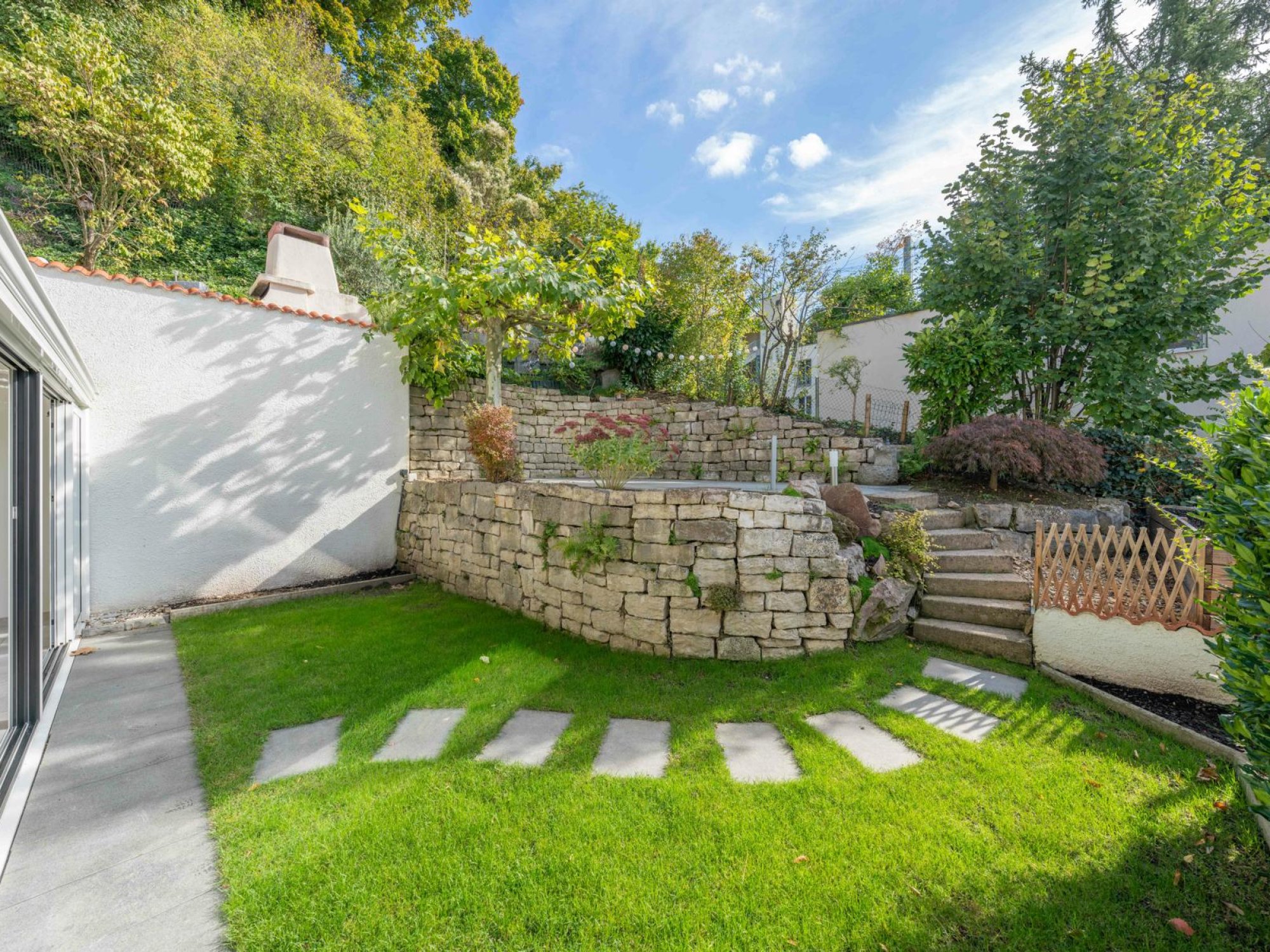 Der erhöhte Gartensitzplatz mit üppiger Bepflanzung schafft ein naturnahes Ambiente und lädt zum Verweilen ein.